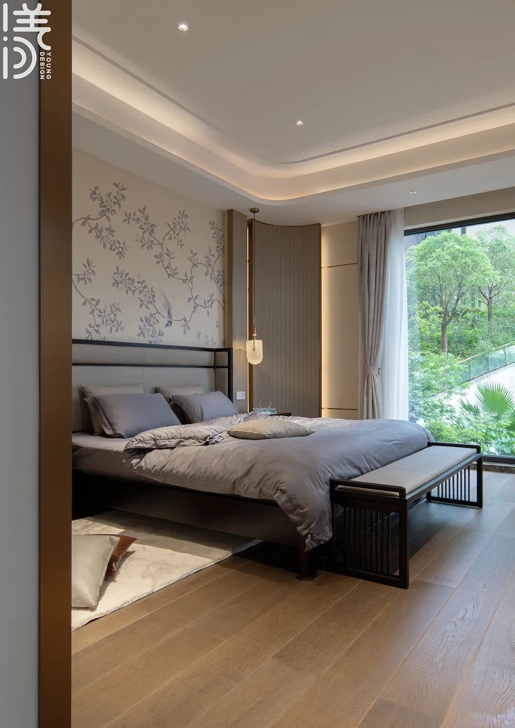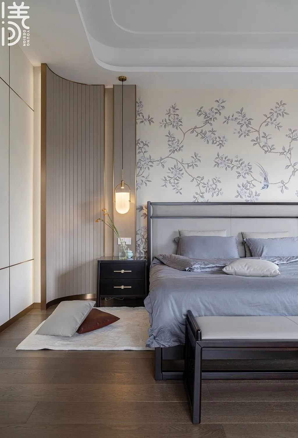 ▲主卧以花纹墙纸+木饰面为床头墙,布置一张实木+皮艺材质的床铺,床头柜上还有床头吊灯的呼应装饰,布置灰色床单,床尾还有一张床尾凳,为主人布置了儒雅安静而舒适的卧室空间。