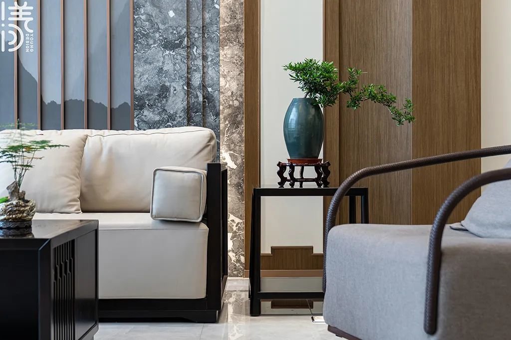 ▲沙发旁的小边几放置一盆小巧精致的盆景植物,为整个客厅增添一份儒雅的氛围,不仅为家居增添一抹自然气息,同时也能让人们感觉到悠闲与恬静的氛围。