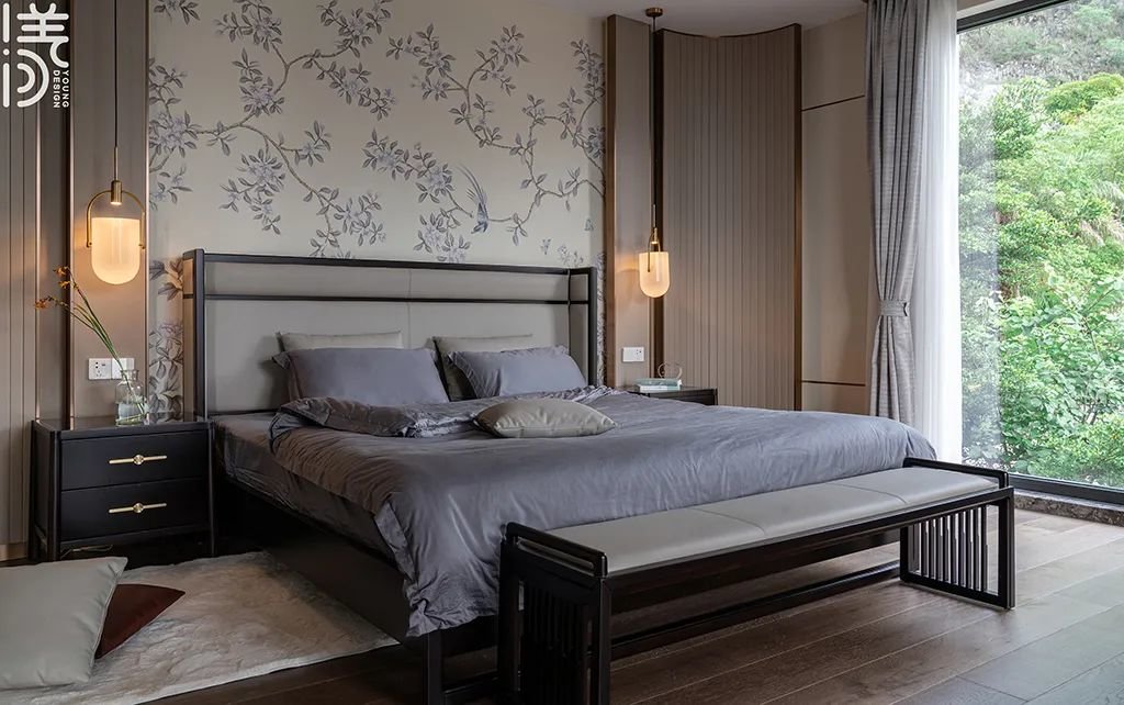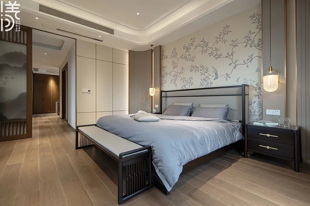 ▲床侧边是软包墙面,装一扇屏风门,也让空间更具中式的雅韵气息。