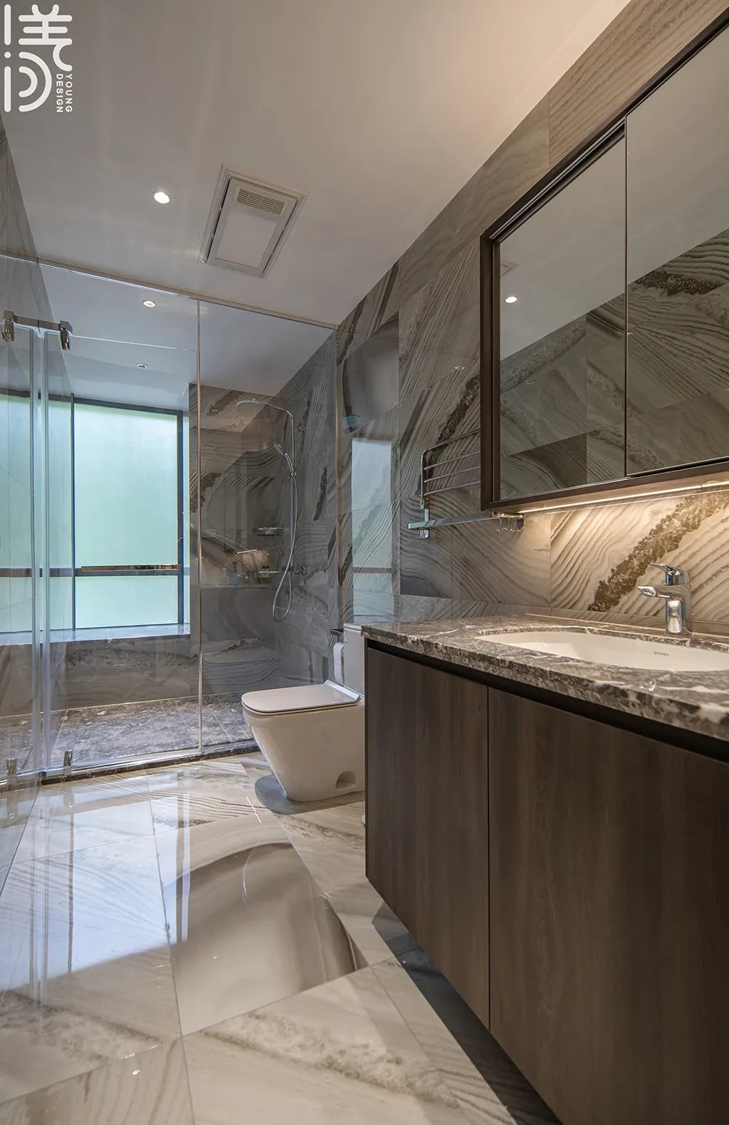 ▲主人卫生间以暖灰色系的瓷砖,带来温馨舒适的氛围,通过选择适当的色调和现代化的卫浴设施,营造一个时尚而舒适的主人卫生间。