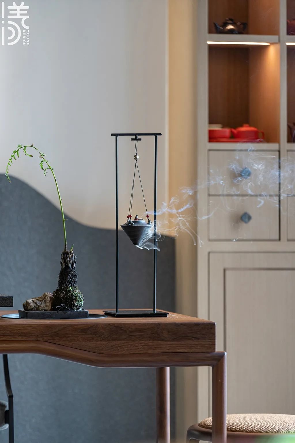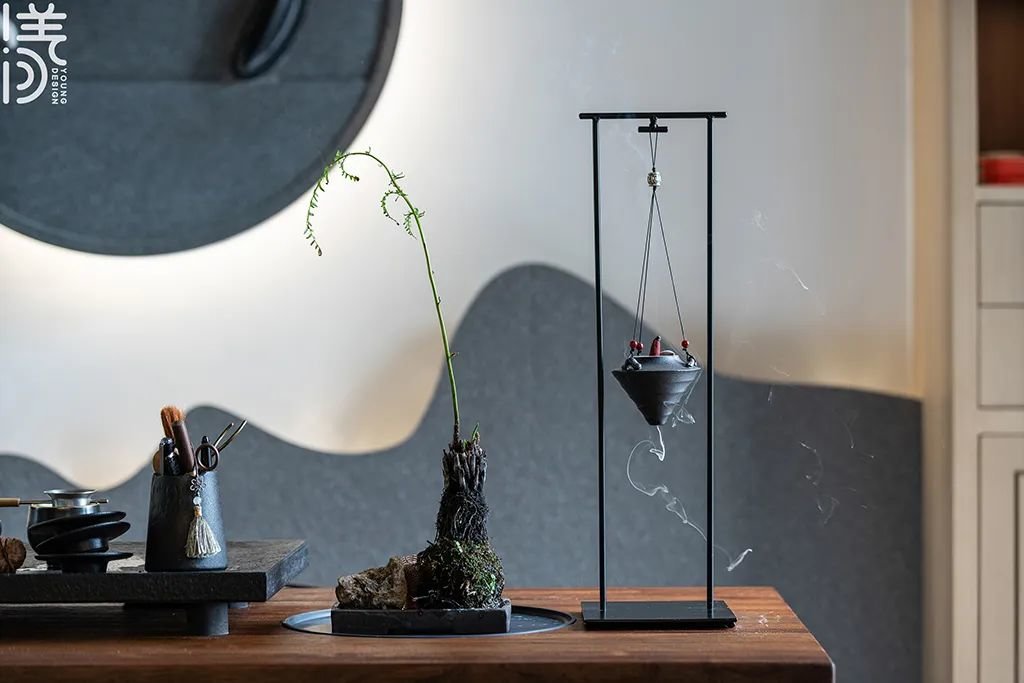 ▲茶室里摆有茶具与香薰,增添了空间的设计意境。