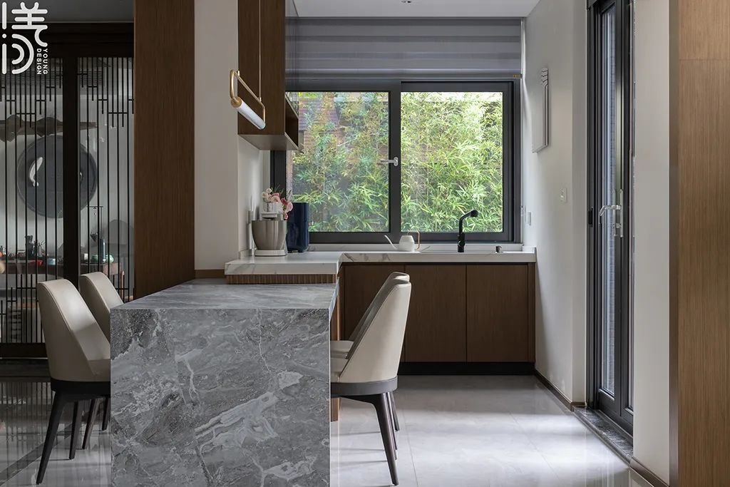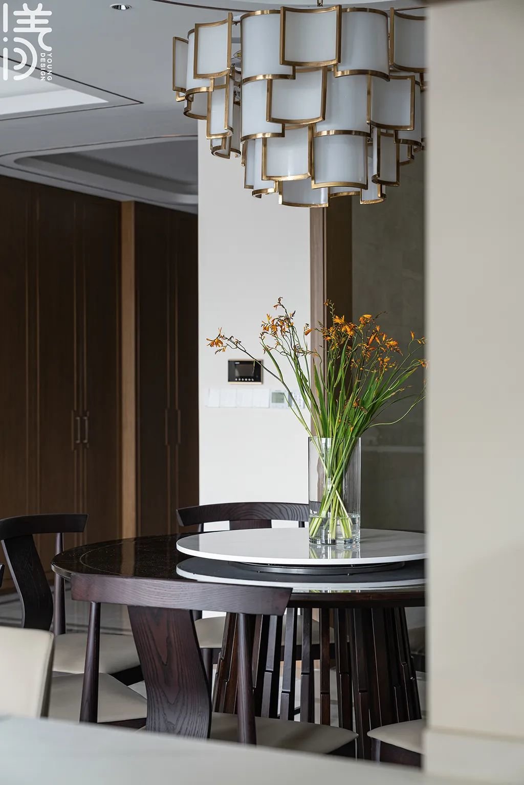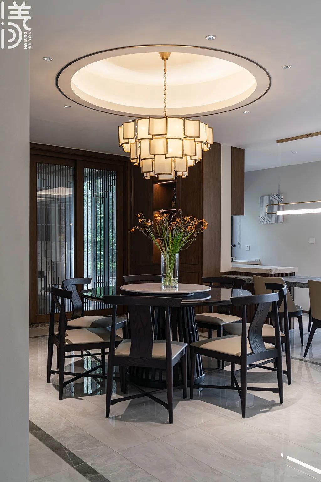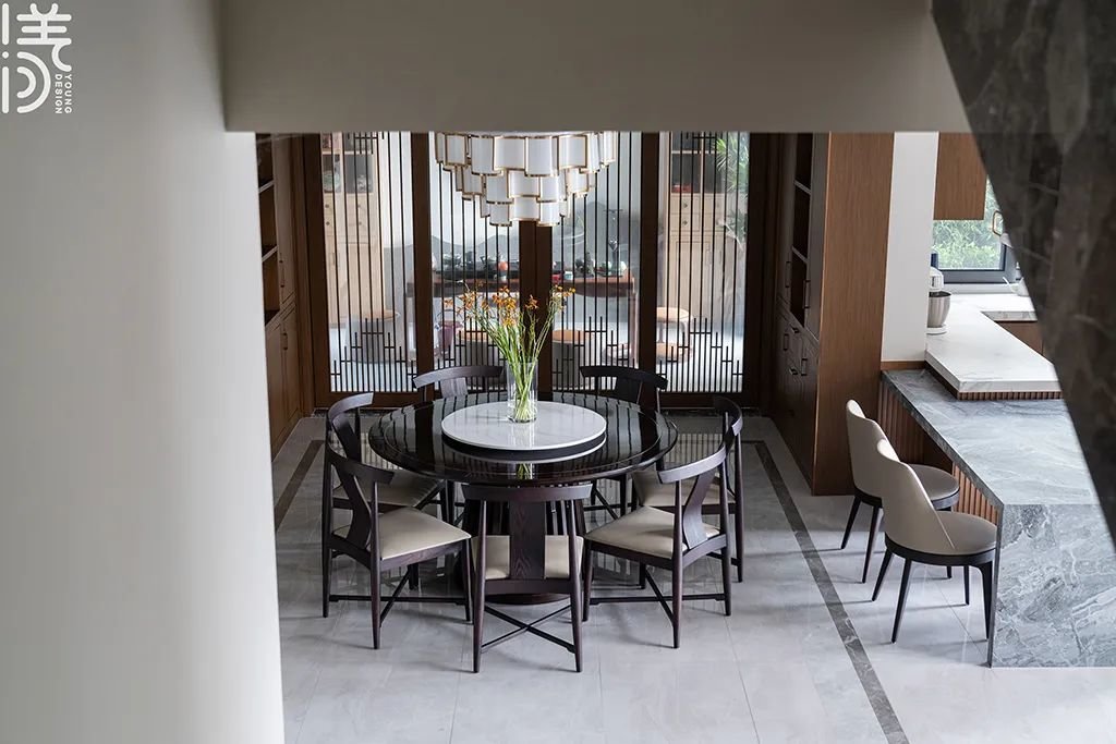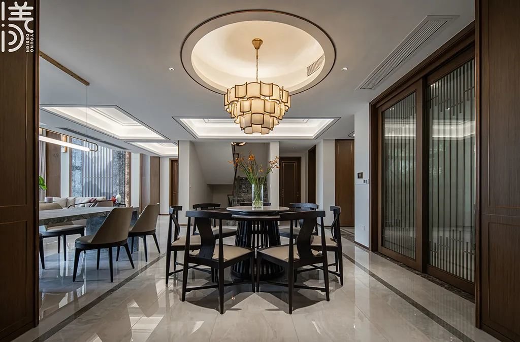 ▲餐厅采用圆形餐桌+方形中岛台的双餐桌组合,实现了多样化的用餐体验,同时达到视觉上的平衡和美感;而天花是圆形吊顶,营造出柔和舒适的氛围,大吊灯则为房间增添豪华感。