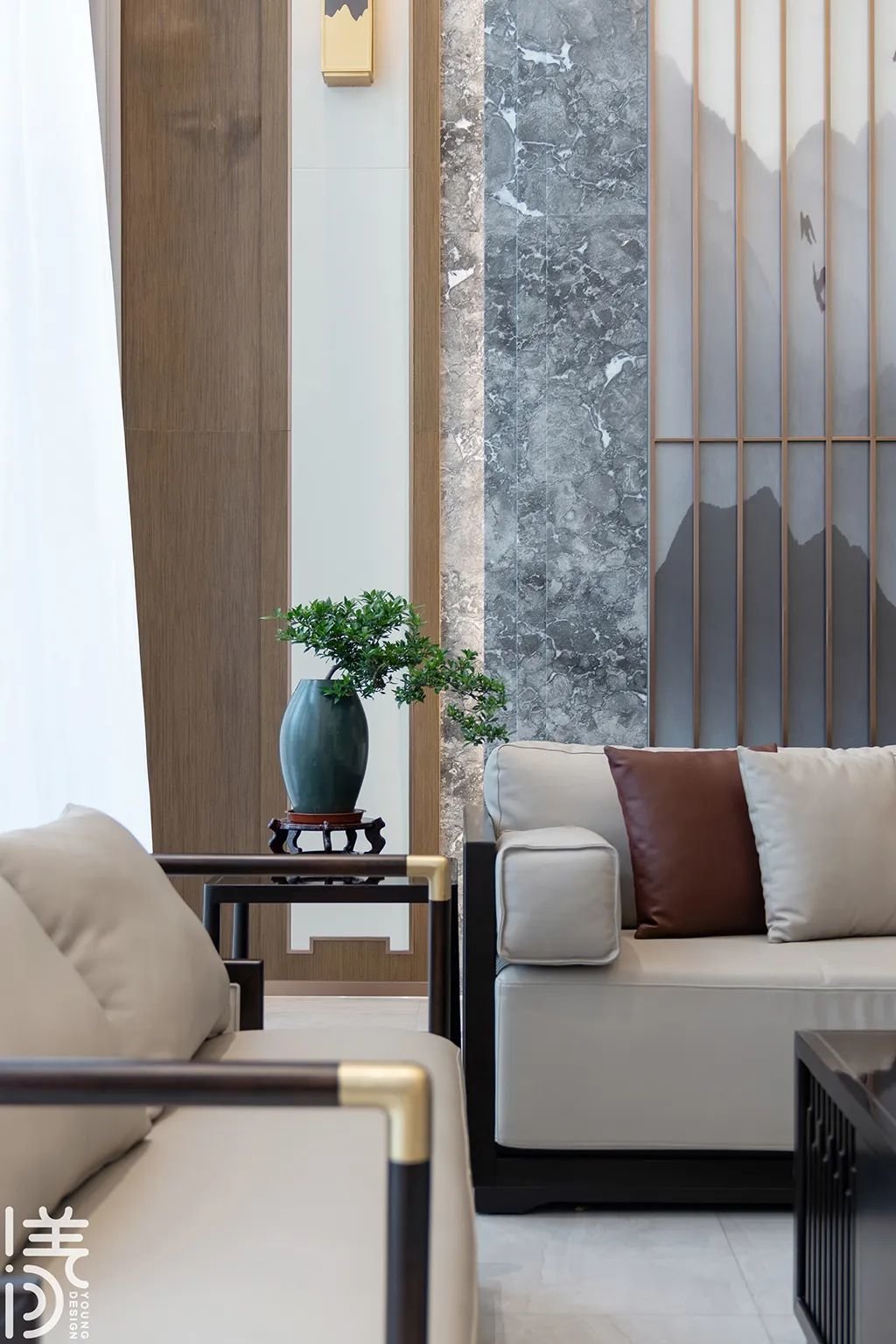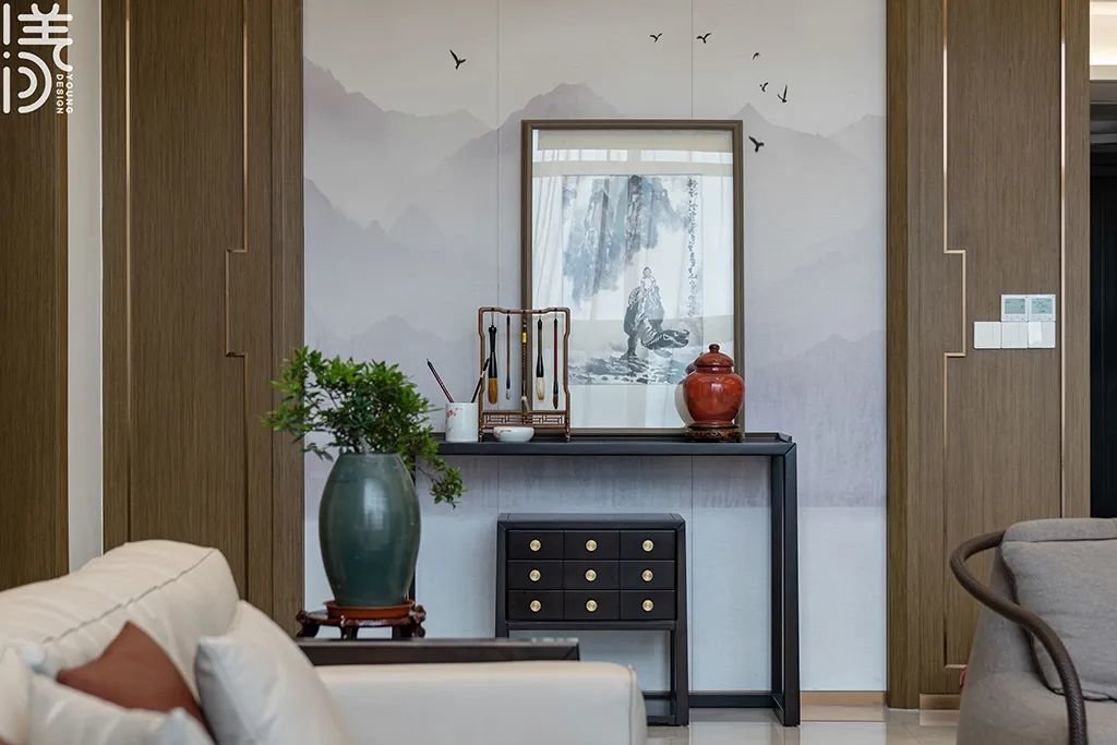 ▲前厅布置了端景台、盆景、中式画和笔墨四个元素的设计,旨在营造一种充满东方文化气息的艺术空间,让人们能够在其中感受到深厚的文化底蕴。