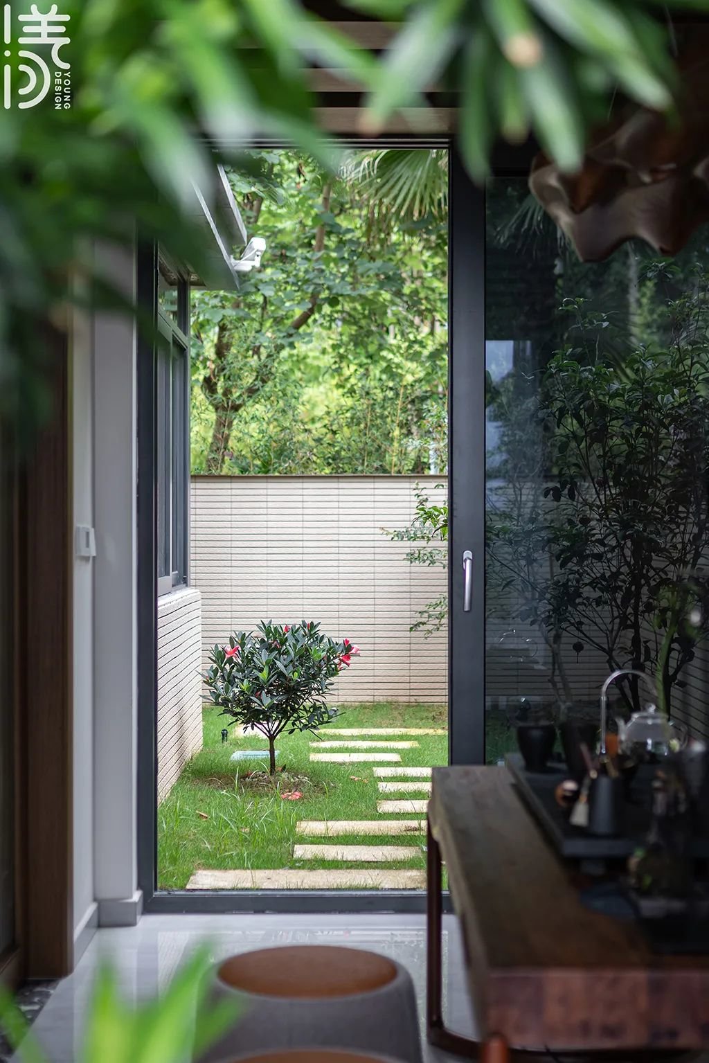 ▲中式茶室连着室外的院子,院子里花草树木充满自然气息,青石铺路,也为主人提供了轻松舒适的小院体验。