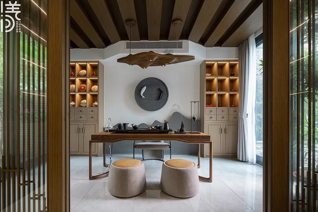 ▲中式茶室的背景墙是整个空间的中心位置,也是营造茶室文化氛围的关键,采用墨色元素和对称多宝格的设计,营造出一种宁静、舒适的氛围,让人们可以在此放松身心、品尝美好的茶香。