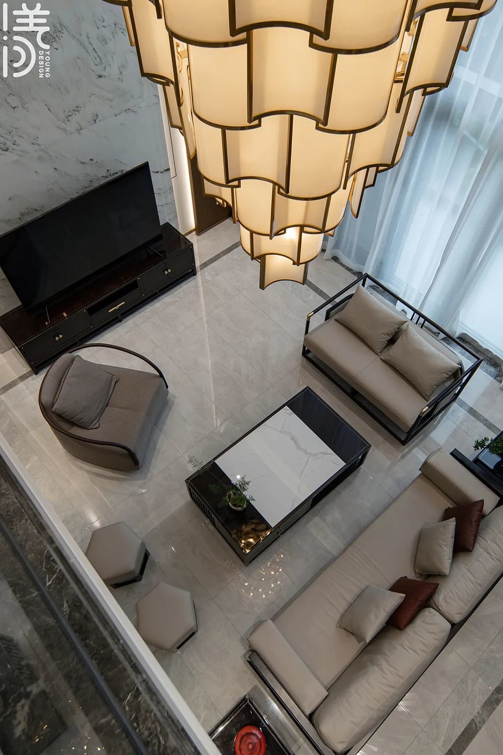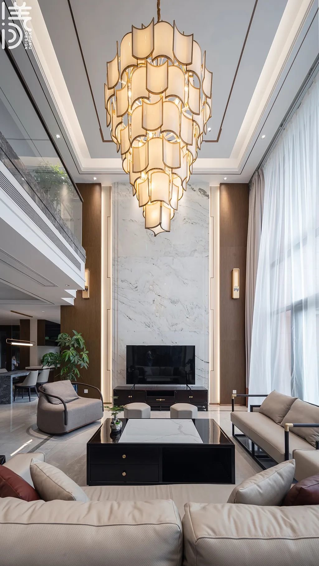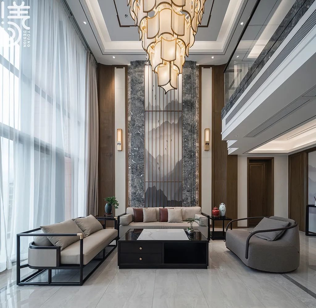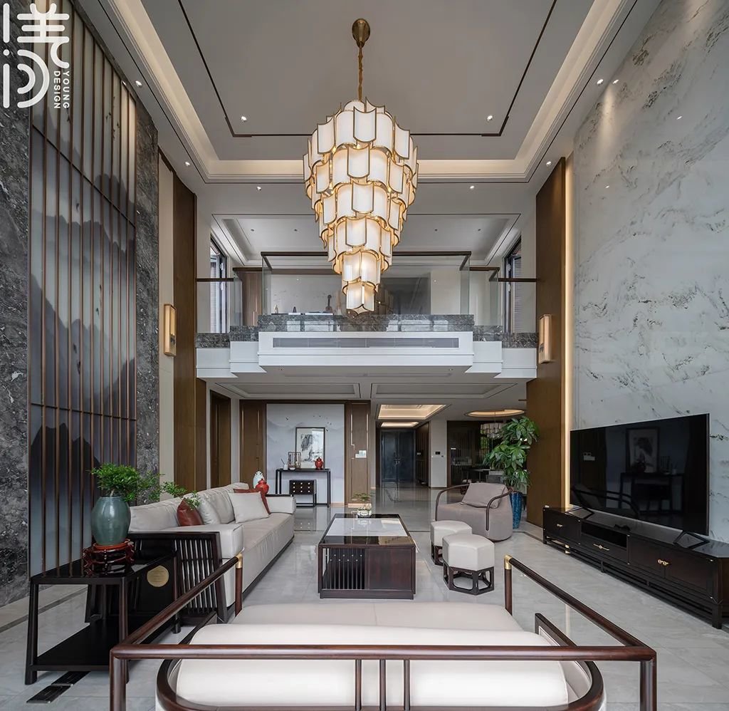 ▲通过挑高工艺将空间展现出不同的层次感和空间感,让整个房间显得更加宽敞明亮,同时融入新中式设计元素,形成一种文化、艺术的独特氛围,让居住者在此感受到舒适、自在和高雅的生活体验,打造一个优雅且富有现代感的新中式客厅。