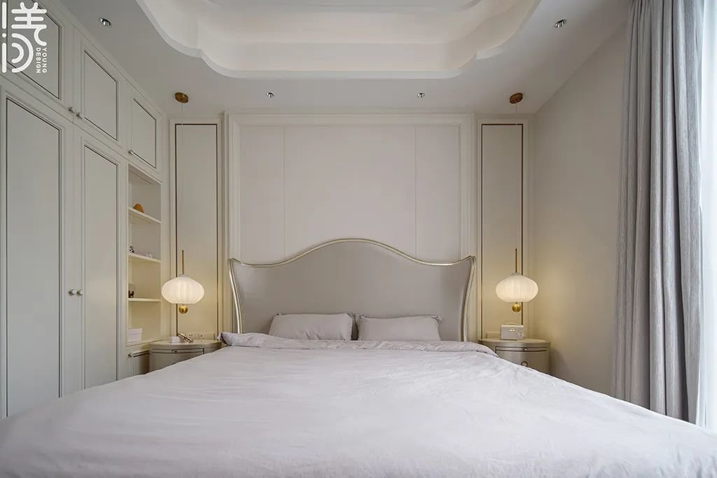 ▲次卧空间以奶油色为主色调,该色调不仅柔和舒适,两侧对称的床头柜加上台灯,更能为整个空间带来一种温馨的感觉;左侧布置了一个衣柜,衣柜最里面的地方做了开放格的设计,这能够方便随时进行临时收纳。