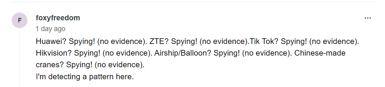 “华为?间谍!(没有证据)。中兴?间谍!(没有证据)。Tik Tok?间谍!(没有证据)。海康威视?间谍!(没有证据)。飞艇/气球?间谍!(没有证据)。中国制造的起重机?间谍!(没有证据)。