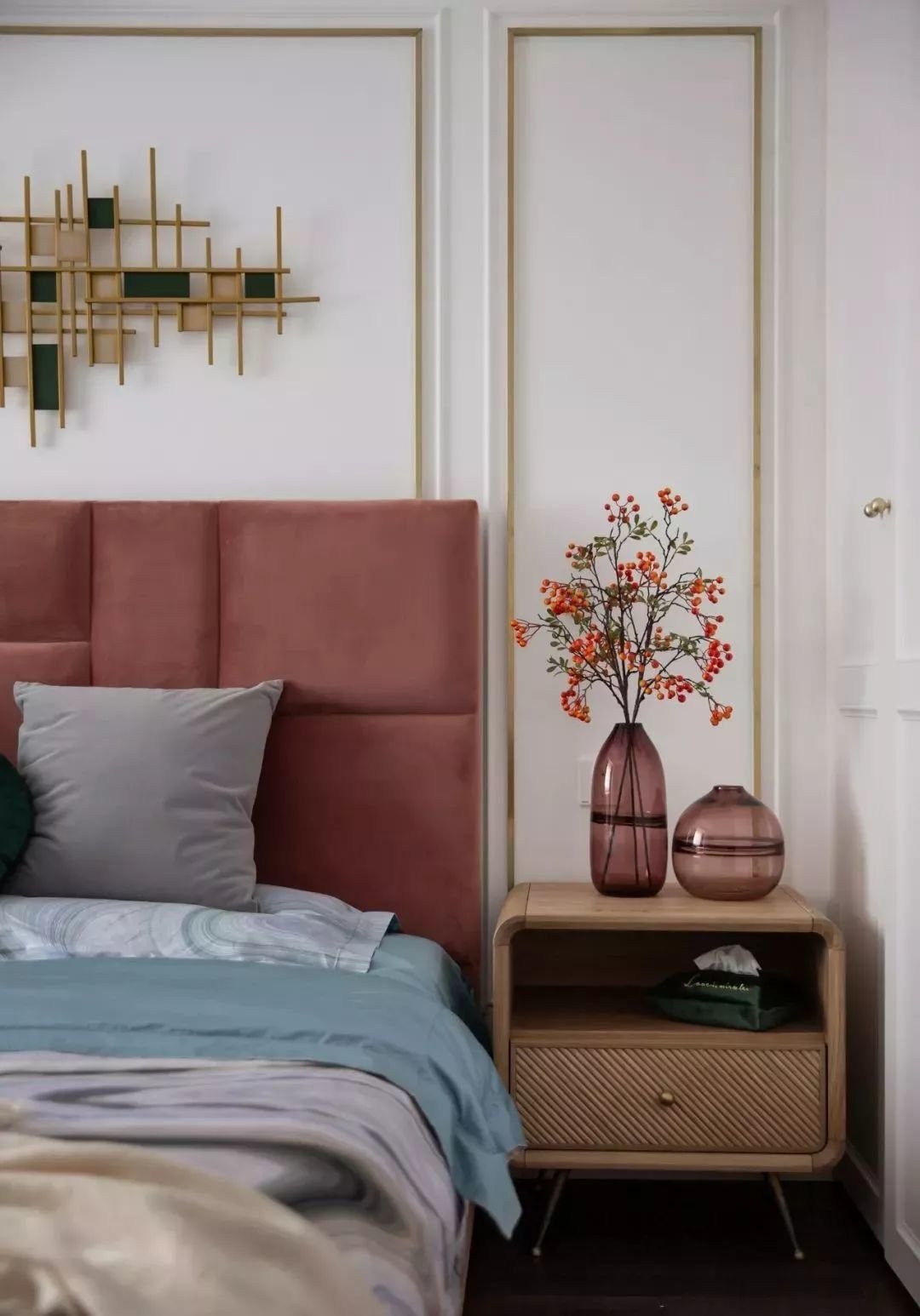 运用软包来装饰床头背景墙,会让卧室显得高档不少,比较适用于欧式风格、美式风格等设计。