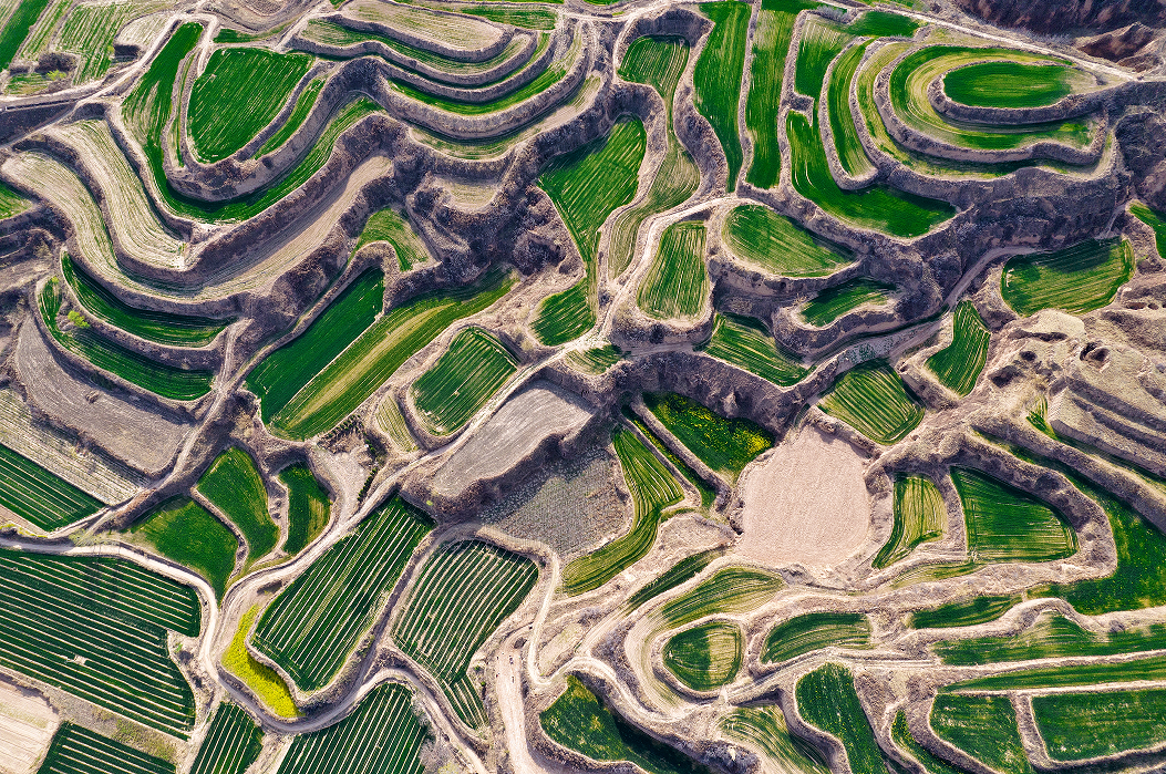 近日,山西芮城,航拍镜头下的永乐镇黄土梯田春意盎然。黄土梯田被层层绿色麦苗覆盖,金黄色的油菜花点缀其间,满眼春色,美不胜收。(刘宝成)