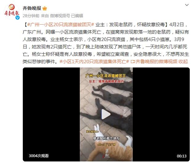 4月2日,广东广州。网曝一小区流浪猫集体死亡,在猫窝旁发现散落一地的老鼠药,疑似有人故意投毒。业主杨女士表示,小区有20只流浪猫,其中包括4只小猫崽。3月9日,她发现有2只猫死亡,到了晚上陆续发现了其他猫尸体,一天时间内几乎都死亡。杨女士称怀疑是有人故意投毒,希望能立案调查,安全隐患很大,不想再发生类似悲惨的事件。