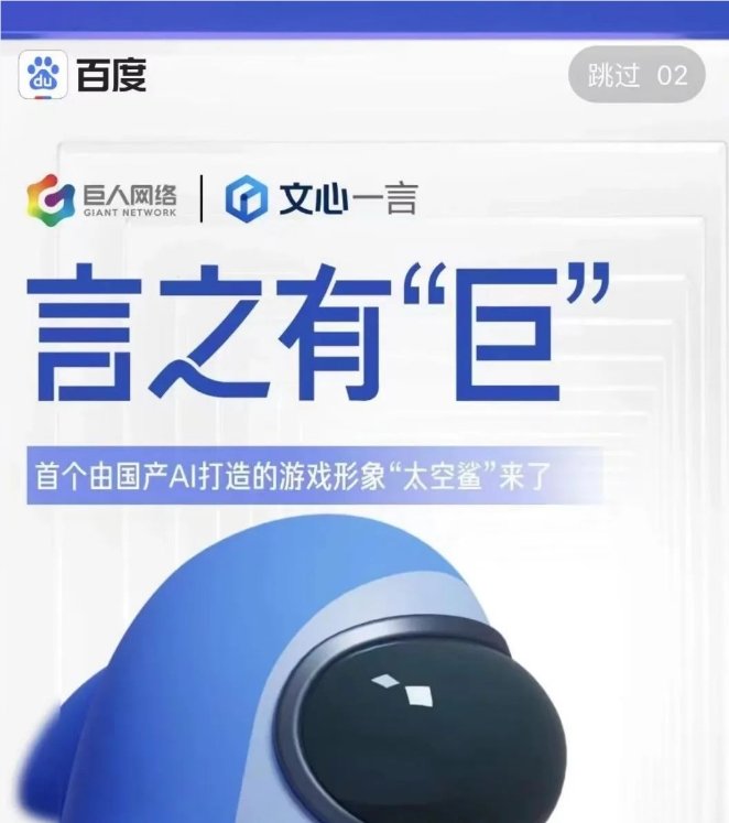 此前,巨人网络旗下《太空行动》与百度文心一言联合推出第一个由国产AI生成的手游形象“太空鲨”,该形象衍生的身份套装后续将在手游内上线。