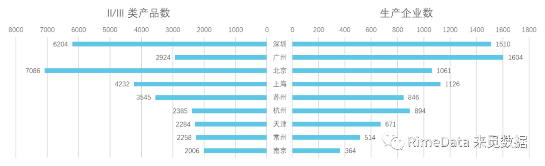 图表 8:2021年各城市医疗器械生产企业数和对应II/III类产品数