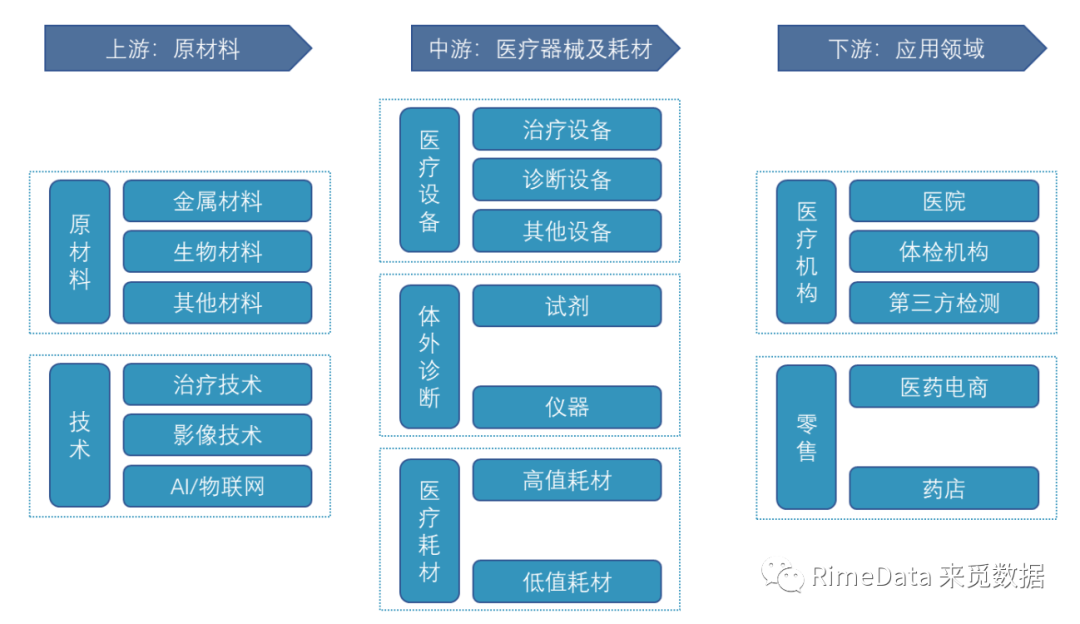 医疗器械是指直接或者间接用于人体的仪器、设备、器具、体外诊断试剂及校准物、材料以及其他类似或者相关的物品,包括所需要的计算机软件。从产业链的角度来看,医疗器械上游主要包括金属材料、生物材料等,关联学科众多;产业链中游为医疗设备、体外诊断所涉及的试剂和仪器、医疗耗材等;产业链下游是对接居民的零售终端、医疗机构等。