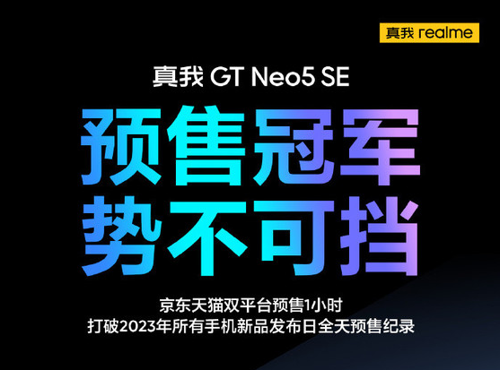 预售开启后不久,手机中国从官方了解到,真我GT Neo5 SE京东天猫双平台预售1小时打破2023年所有手机新品发布日全天预售纪录!