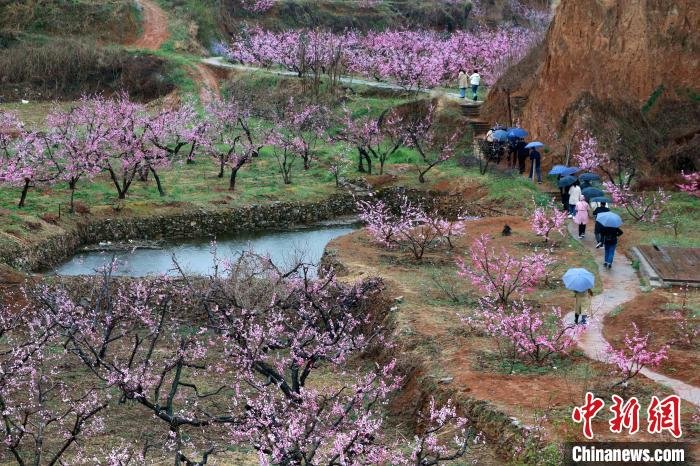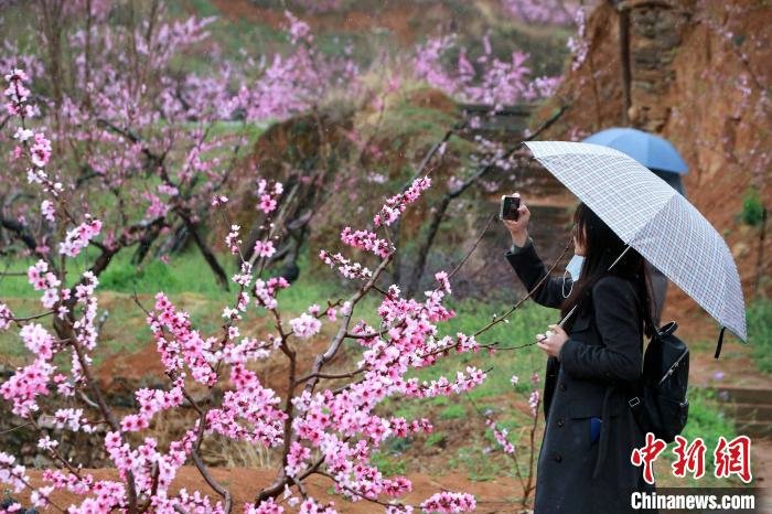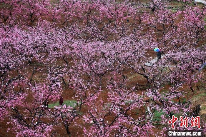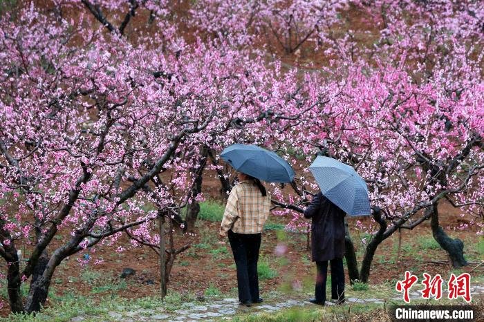 4月3日,“中国佛桃之乡”山东泰安肥城刘台桃花源风景区内,10万余亩桃花进入盛花期,民众在雨中赏花。中国肥城第22届桃花节于3月25日至4月20日举行。从2002年肥城举办首届桃花节以来,已经走过21年的历程,肥城桃花节已跻身中国四大桃花节之一,为中国知名春季踏青赏花旅游胜地。