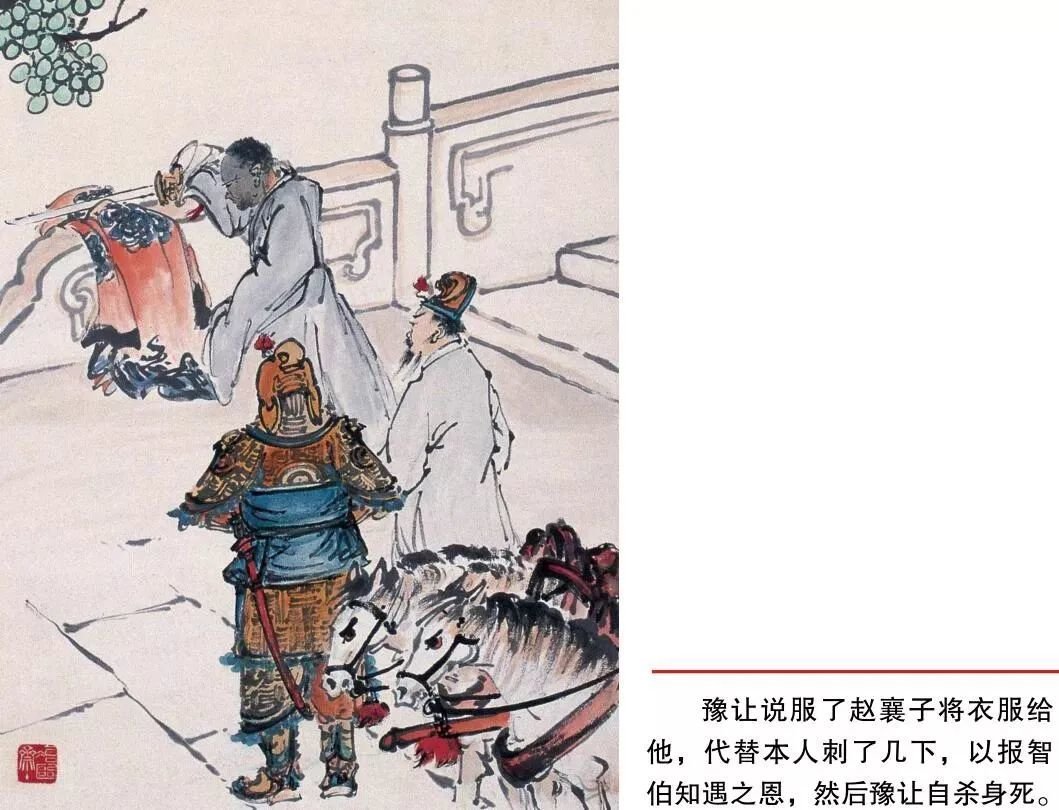 最后,豫让说服了赵襄子将衣服给他,代替本人刺了几下,以报智伯之遇之恩,然后豫让自杀身死。他死后,名声也传遍了天下。