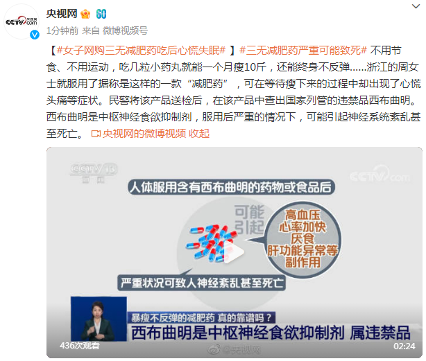 不用节食、不用运动,吃几粒小药丸就能一个月瘦10斤,还能终身不反弹……浙江的周女士就服用了据称是这样的一款“减肥药”,可在等待瘦下来的过程中却出现了心慌头痛等症状。民警将该产品送检后,在该产品中查出国家列管的违禁品西布曲明。西布曲明是中枢神经食欲抑制剂,服用后严重的情况下,可能引起神经系统紊乱甚至死亡。