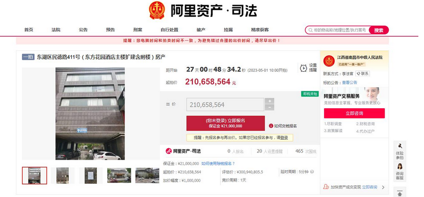 4月3日,记者在阿里资产司法拍卖平台上查询到,东湖区民德路411号(东方花园酒店主楼扩建含附楼)房产(一拍)挂网公示,该则信息显示,拍卖的建筑用途为商业、金融、信息,面积为11413.41平方米,评估价为300940805.5元,起拍价为210658564元。
