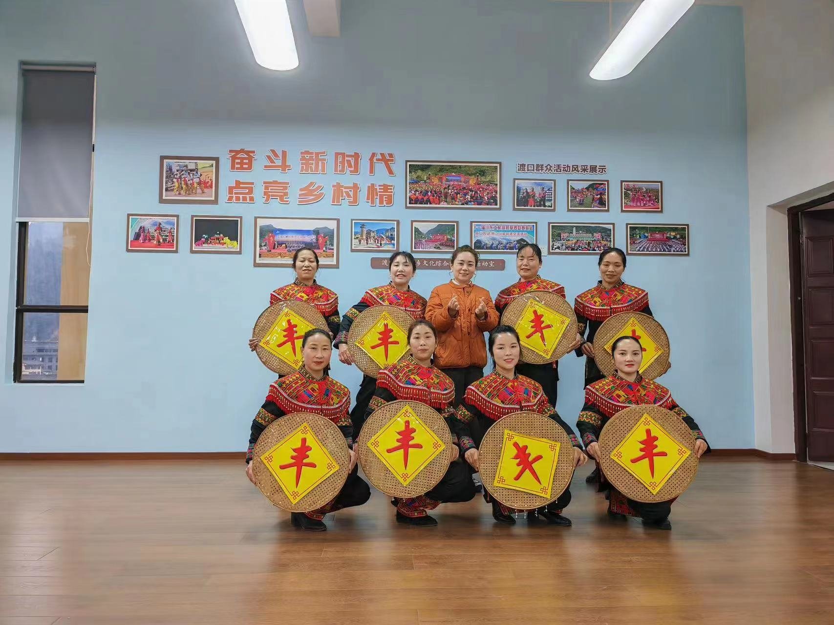 图为宣汉县文化馆的文化特派员向海燕老师指导渡口土家族乡土家族群众跳“筛米舞”后的合影。新华社发(张平摄)