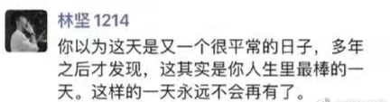 Creme朋友圈:你以为这天是又一个很平常的日子,多年之后才发现,这其实是你人生里最棒的一天。这样的一天永远不会再有了。