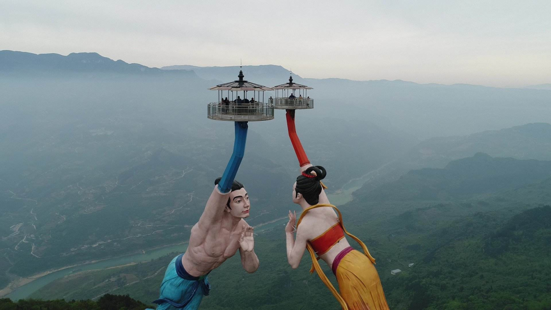 还有具象建筑的经典之作,重庆武隆一景区内的“飞天之吻”高空娱乐项目。