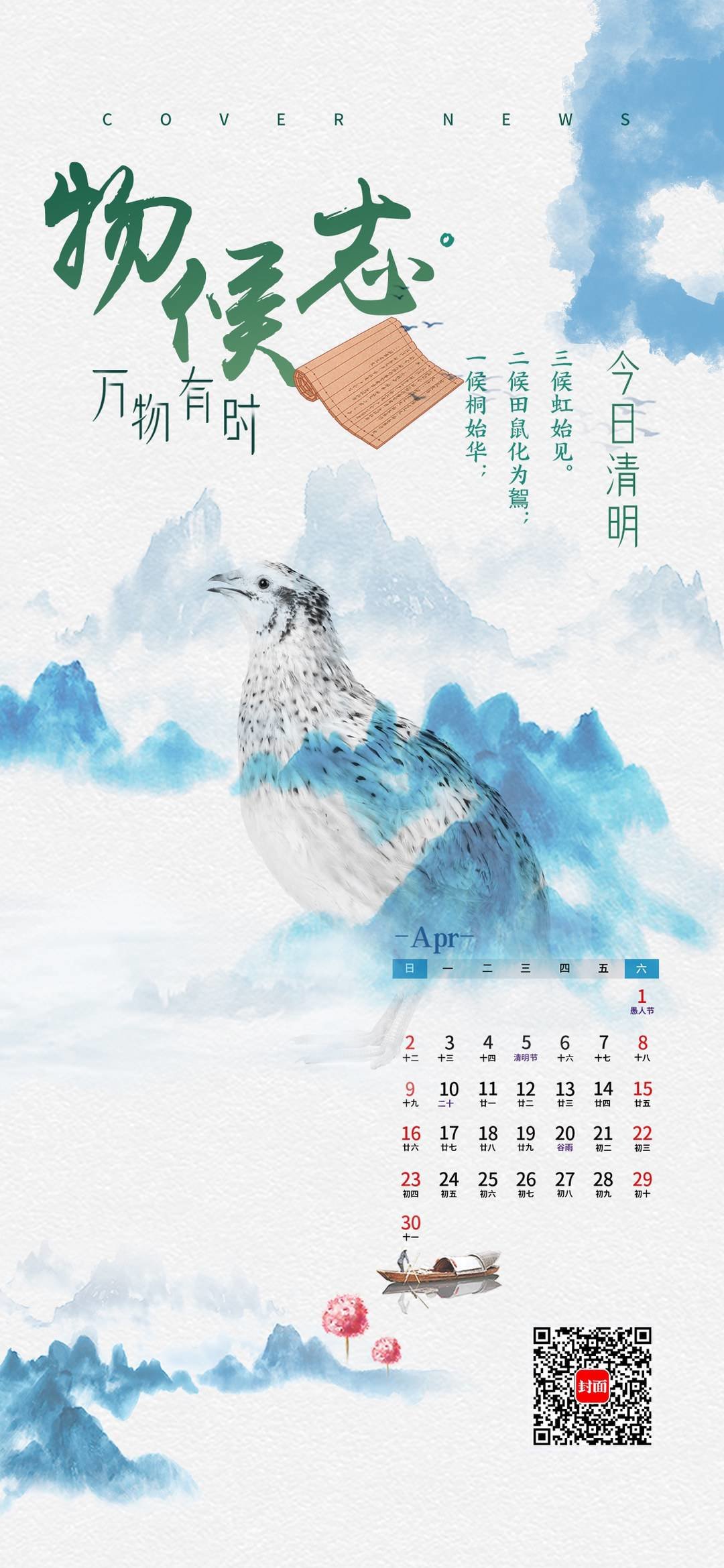 4月5日,在烂漫的春光之中,一年一度的清明节到来。古籍《月令七十二候集解》中这样描写这一节气的物候现象:“一候桐始华;二候田鼠化为鴽;三候虹始见。”这个时节阳光明媚、气清景明、万物皆显,自然界呈现生机勃勃的景象。先是白桐花开放;田鼠因烈阳之气渐盛而躲回洞穴,喜爱阳气的鹌鹑类的鸟儿则开始出来活动;然后,雨后的天空中可以见到彩虹了。