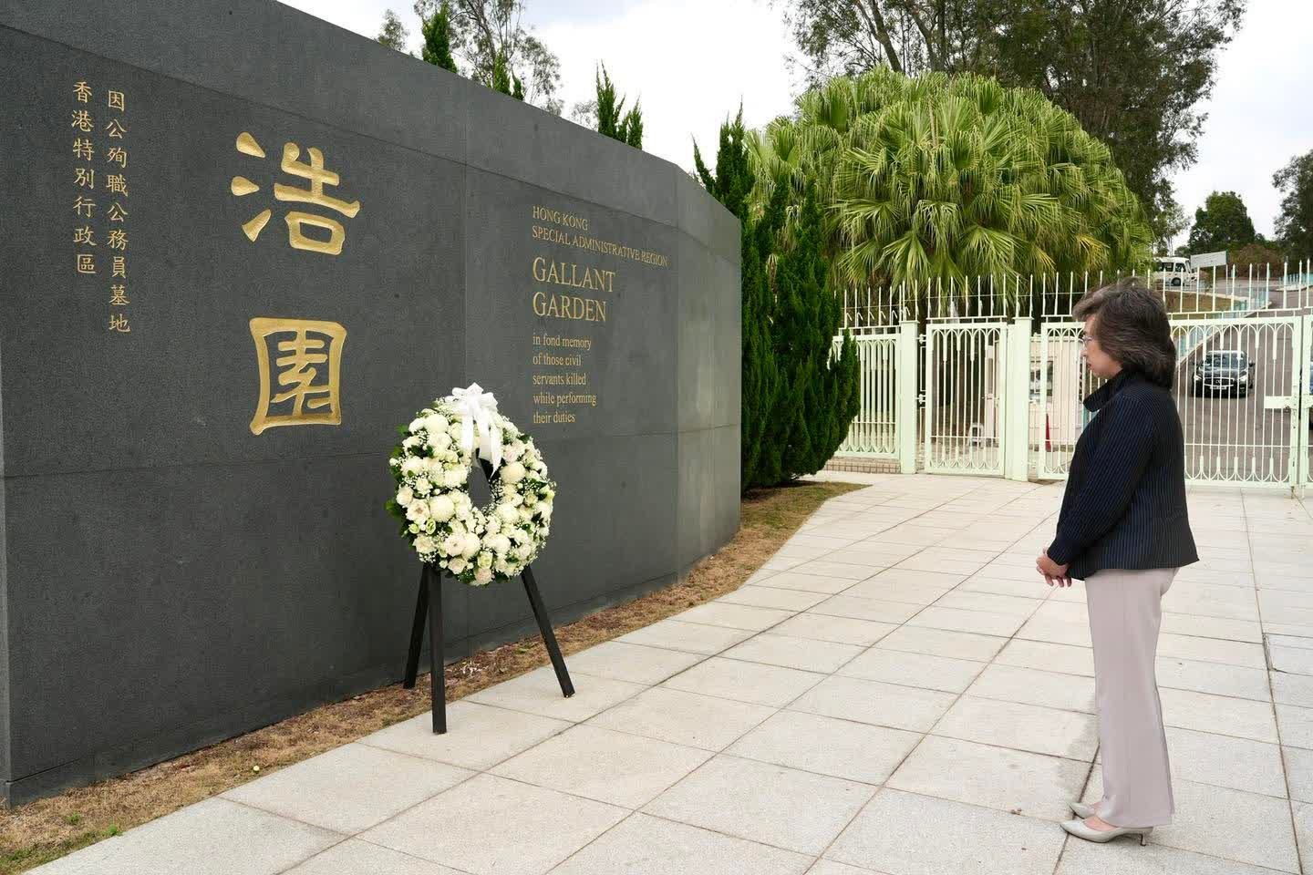 公务员事务局局长杨何蓓茵今日(4月5日)在社交平台发文表示,在清明节前夕,她代表特区政府到浩园,悼念因公殉职的同事,向逝者献上鲜花,致以最崇高的敬意和哀思。