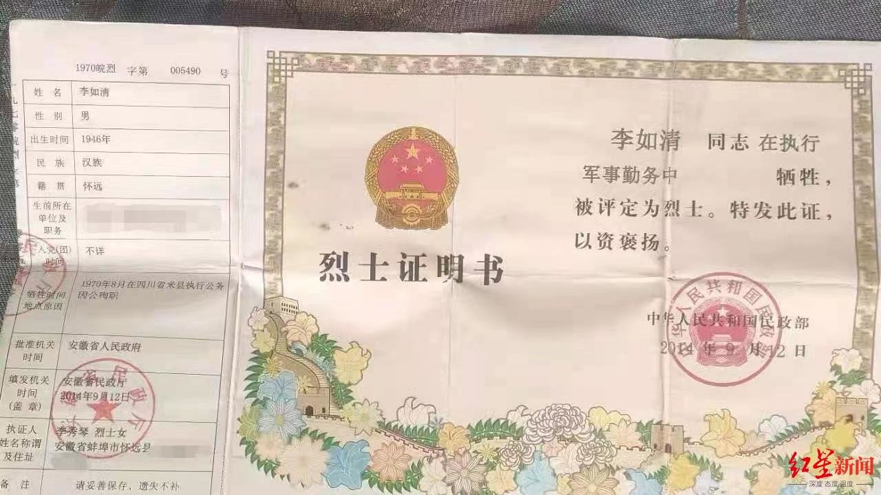 几经辗转,年介涛联系到了李如清烈士的妹妹李秀琴,她向年介涛发来了一份2014年由民政部颁发的李如清烈士证明书,经过核实,李如清烈士正是李秀琴的哥哥。