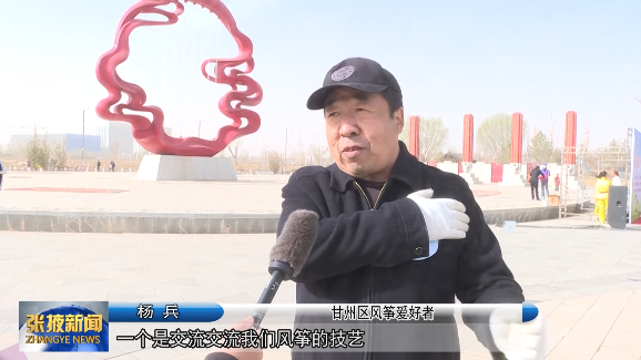 甘州区风筝爱好者 杨兵:“交流我们风筝的技艺,也交流一下别人放起来的风筝,互相对比一下放风筝的技艺、高度,还有风筝的吃风量。”