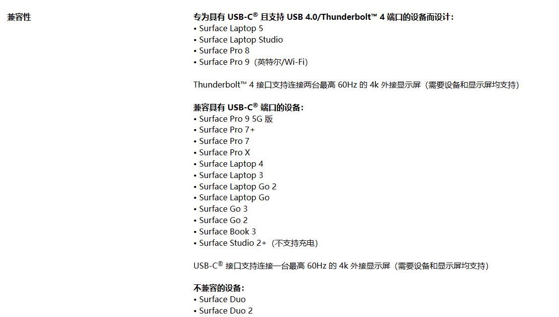 兼容性方面,配备雷电4接口的Surface Laptop 5、Surface Laptop Studio、Surface Pro 8、Surface Pro 9(英特尔版)连接Surface Thunderbolt 4时支持连接两台4K@60Hz显示器。扩展坞兼容部分配备Type-C接口的Surface设备,不过仅能连接一台4K@60Hz显示器。Surface Thunderbolt 4并不支持Surface Duo与Surface Duo 2。