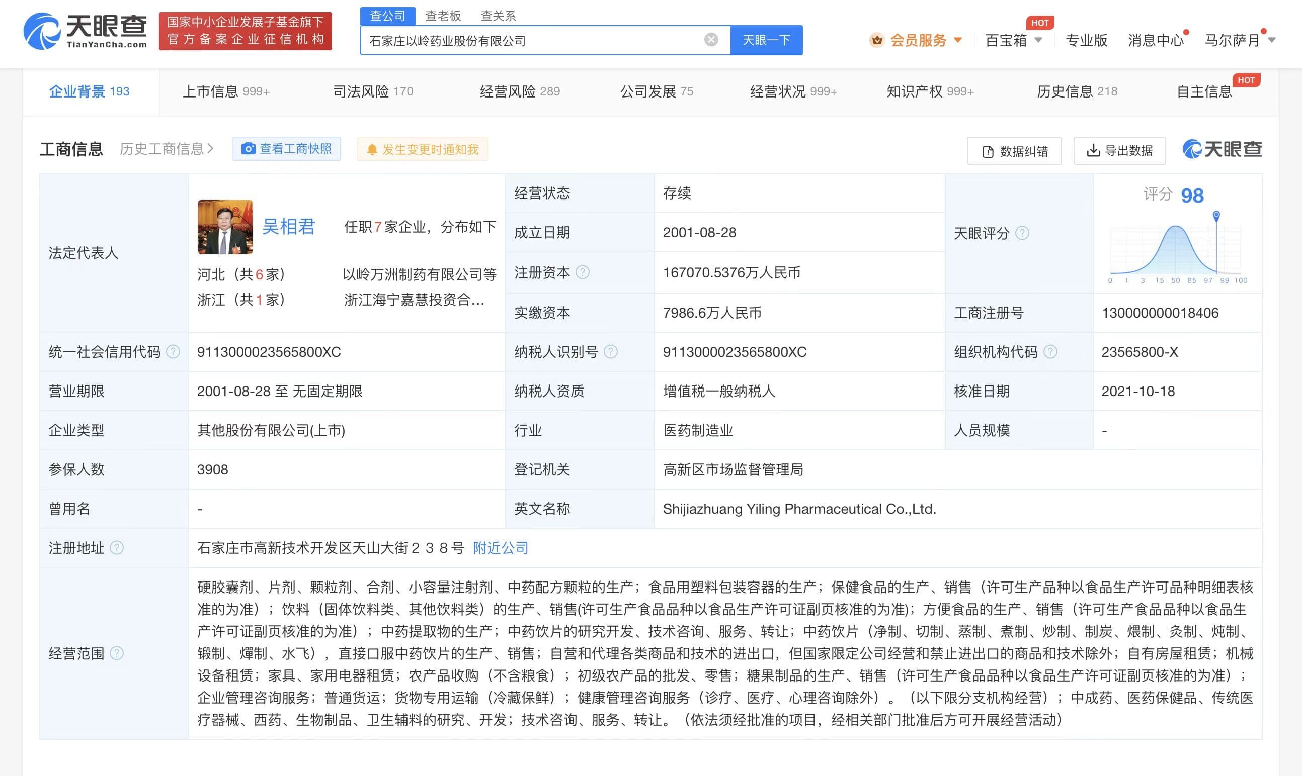 石家庄以岭药业股份有限公司成立于2001年8月,于2011年7月A股上市,注册资本约16.7亿人民币,法定代表人、董事长、总经理为吴相君,主营业务为专利创新中药的研发、生产和销售。