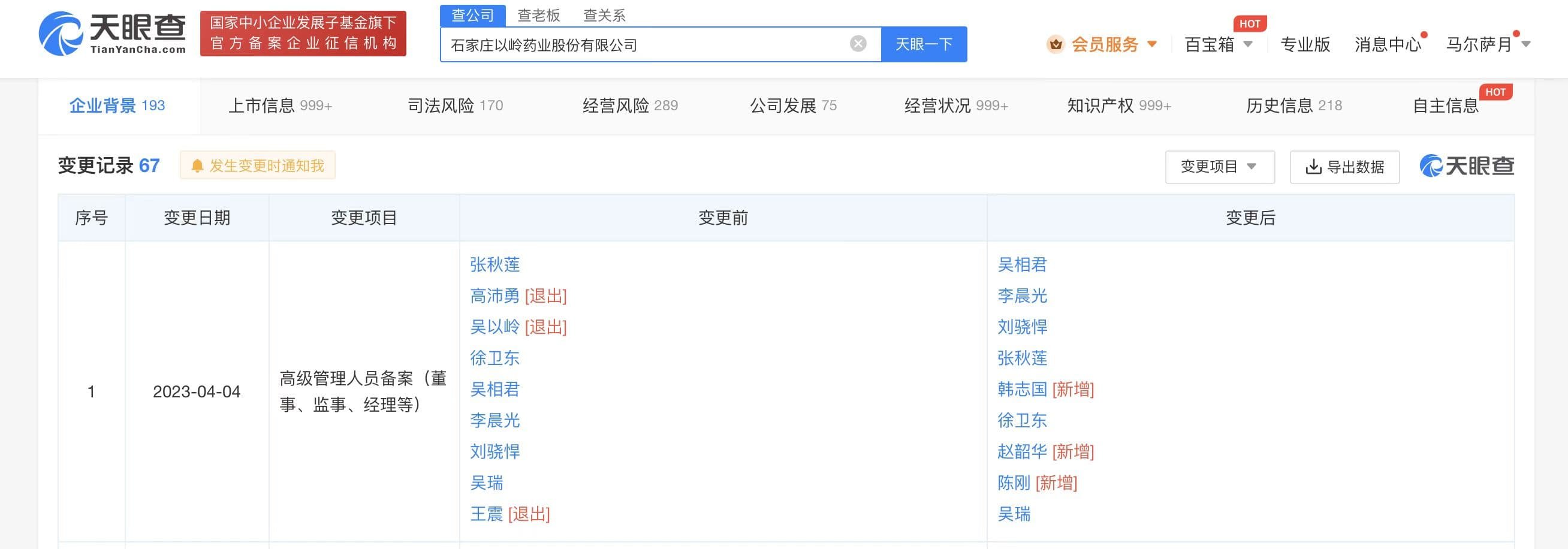 鞭牛士 4月6日消息,天眼查App显示,4月4日,石家庄以岭药业股份有限公司发生工商变更,吴以岭卸任董事长,由董事吴相君接任;王震、高沛勇卸任董事,新增董事赵韶华、韩志国、陈刚。