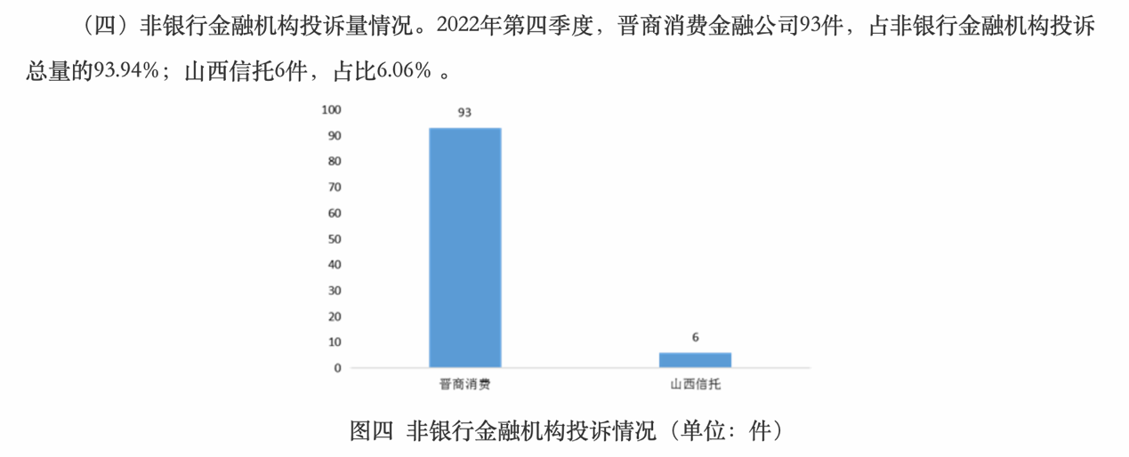 3月31日公布的《中国银保监会山西监管局办公室关于2022年第四季度全省银行业消费投诉情况的通报》显示,2022年第四季度,山西银保监局及辖内各分局共接收并转送银行业消费投诉562件。其中,晋商消金有93件,占非银行金融机构投诉总量的93.94%。