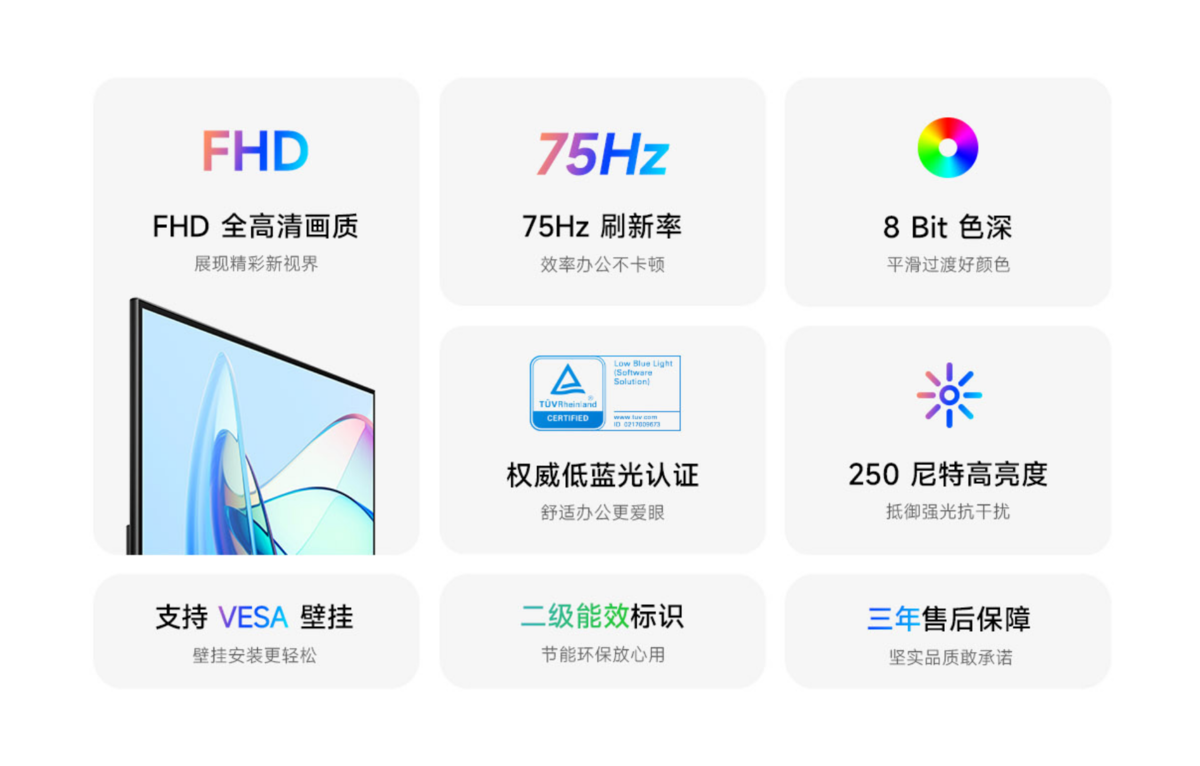 毕竟价格很低,这款显示器的配置自然不会很出色,但也有 FHD 分辨率、75Hz 刷新率和 250nits 的亮度。这块屏幕面板的尺寸为 21.45 英寸,拥有 8bit 的色深,还覆盖了 99% 的 sRGB 色域,这一部分参数还是不错的,但没有提到色准表现。