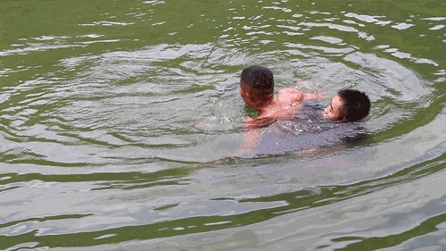 下水救人时,不要从正面接近,防止被溺水者抓、抱。 若被抱住,应放手自沉,溺水者便会放开。救人者应绕到溺水者的背后或潜入水下,从其左腋下绕过胸部,然后握其右手,以仰游姿势将其拖向岸边,也可以在其背后拉腋窝拖带上岸;