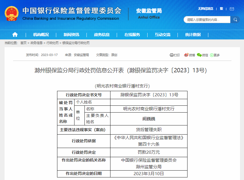 近日,凤凰网安徽从中国银保监会安徽监管局获悉, 明光农村商业银行潘村支行贷后管理失职。 依据《中华人民共和国银行业监督管理法》第四十六条的规定,该行被罚20万元。