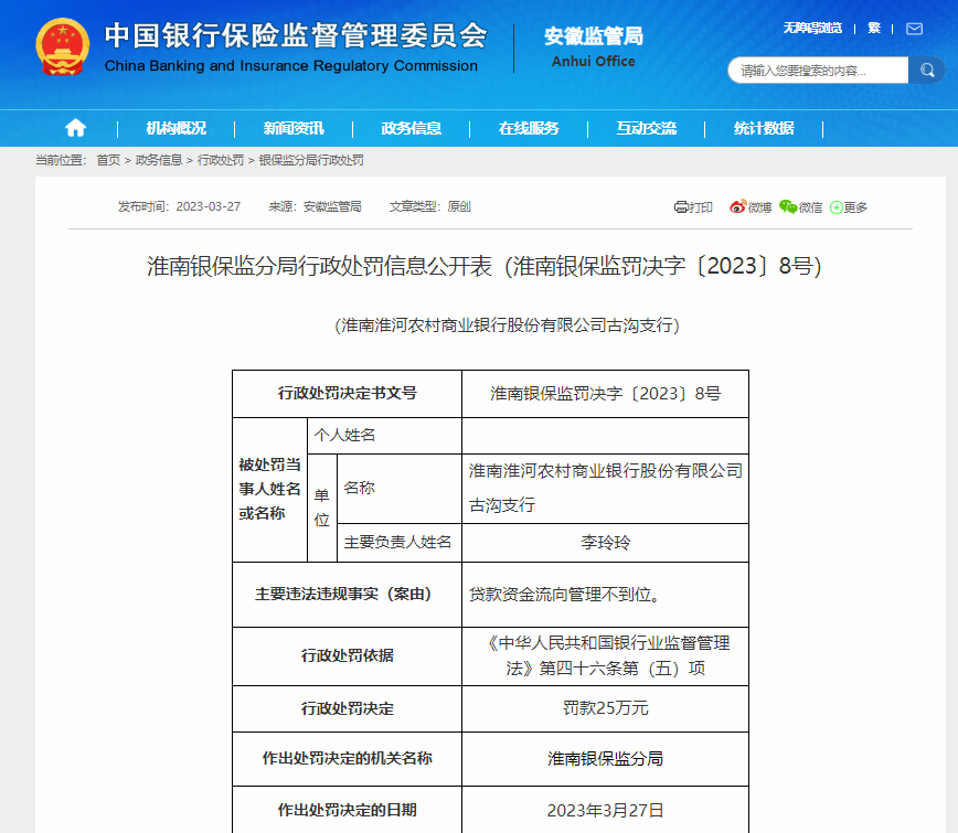 近日,凤凰网安徽从中国银保监会安徽监管局获悉, 淮南淮河农村商业银行股份有限公司古沟支行贷款资金流向管理不到位。 依据《中华人民共和国银行业监督管理法》第四十六条第(五)项的规定,该行被罚25万元。