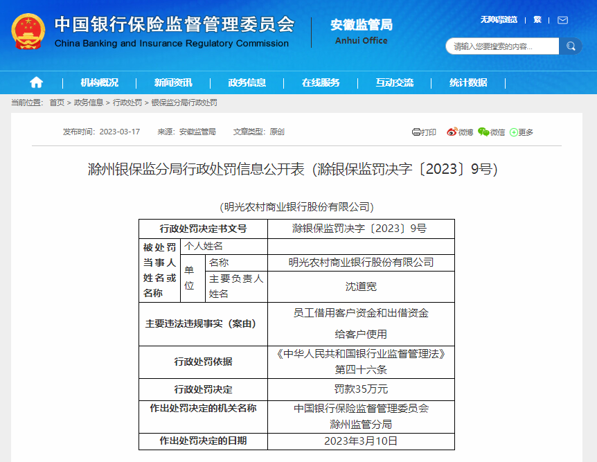 近日,凤凰网安徽从中国银保监会安徽监管局获悉, 明光农村商业银行股份有限公司员工借用客户资金和出借资金给客户使用。 依据《中华人民共和国银行业监督管理法》第四十六条的规定,该行被罚35万元。