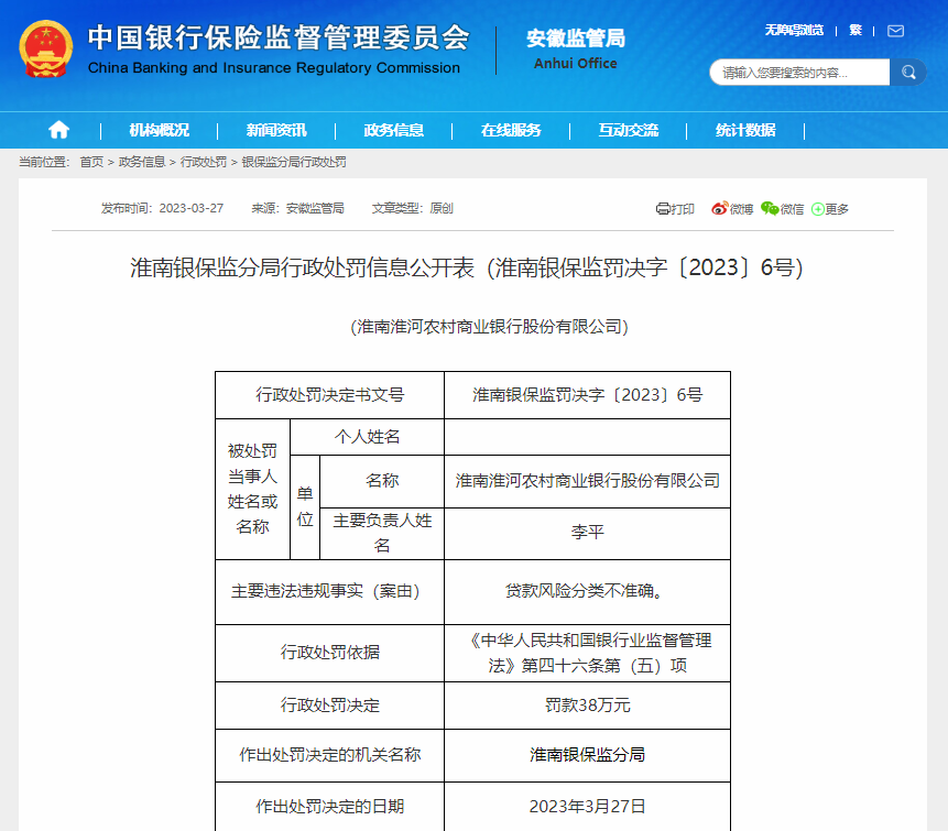 近日,凤凰网安徽从中国银保监会安徽监管局获悉, 淮南淮河农村商业银行股份有限公司贷款风险分类不准确。 依据《中华人民共和国银行业监督管理法》第四十六条第(五)项的规定,该行被罚38万元。