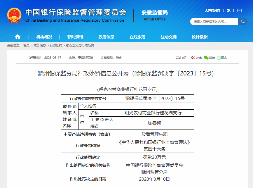 近日,凤凰网安徽从中国银保监会安徽监管局获悉, 明光农村商业银行桂花园支行贷后管理失职。 依据《中华人民共和国银行业监督管理法》第四十六条的规定,该行被罚20万元。