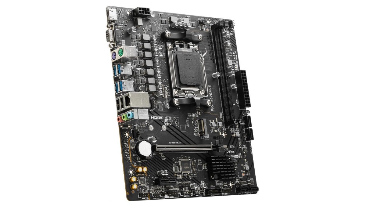 PRO A620M-E为Micro-ATX规格,带有两条DDR5 DIMM插槽,一个M.2 PCIe 4.0插槽,一条PCIe 4.0 x16插槽和一条PCIe 3.0 x1插槽,另外有四个SATA接口。主板还提供了HDMI接口和D-Sub接口用于显示输出,配备了千兆网卡和USB 3.2 Gen1接口( 5Gbps),音频解决方案为Realtek ALC897。