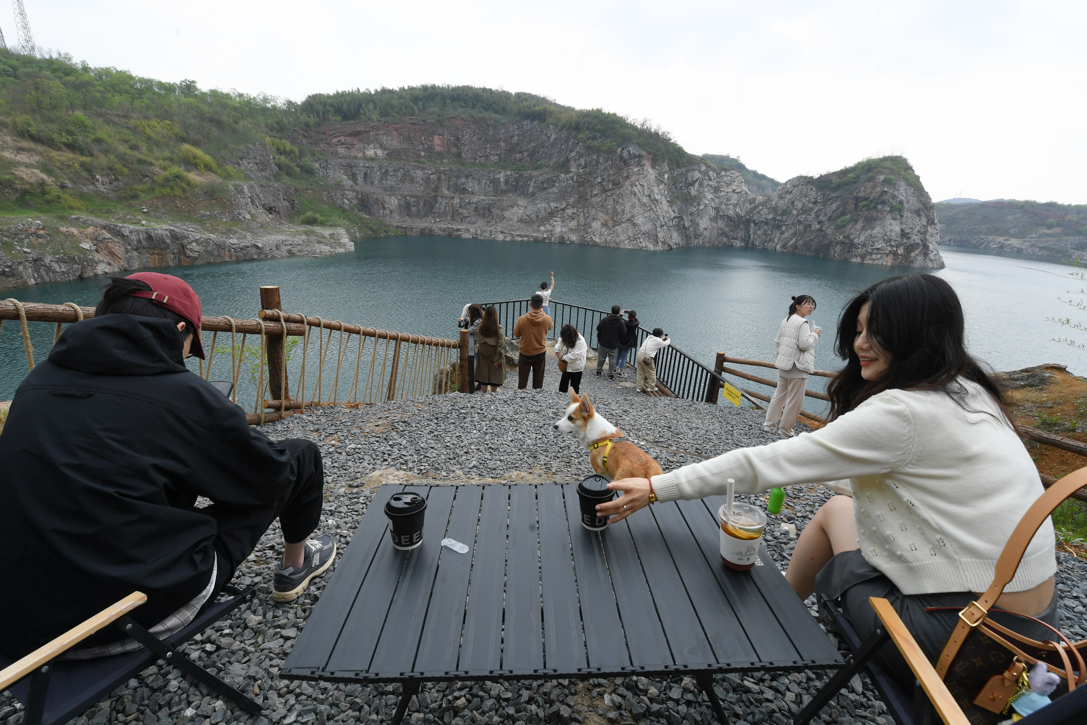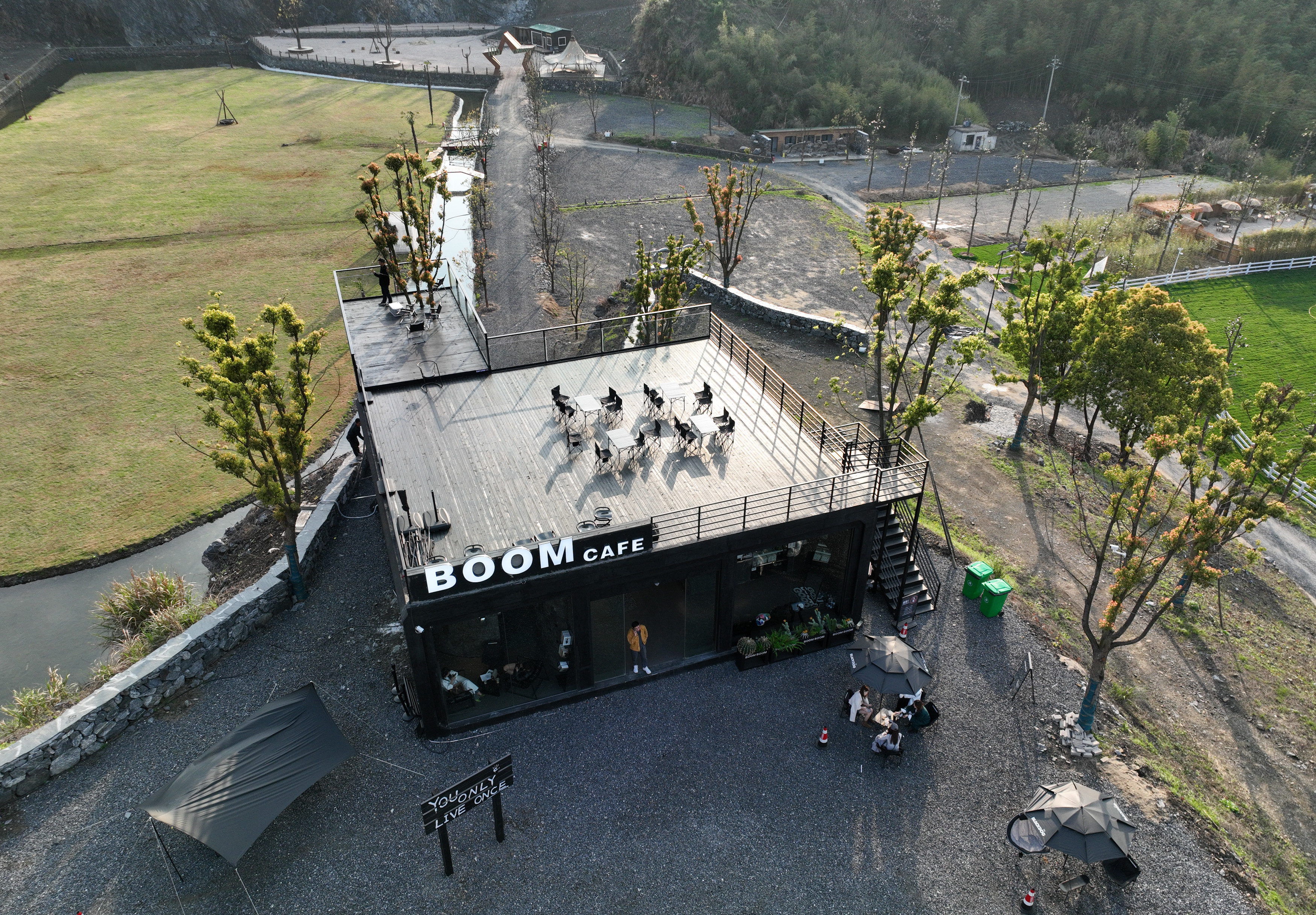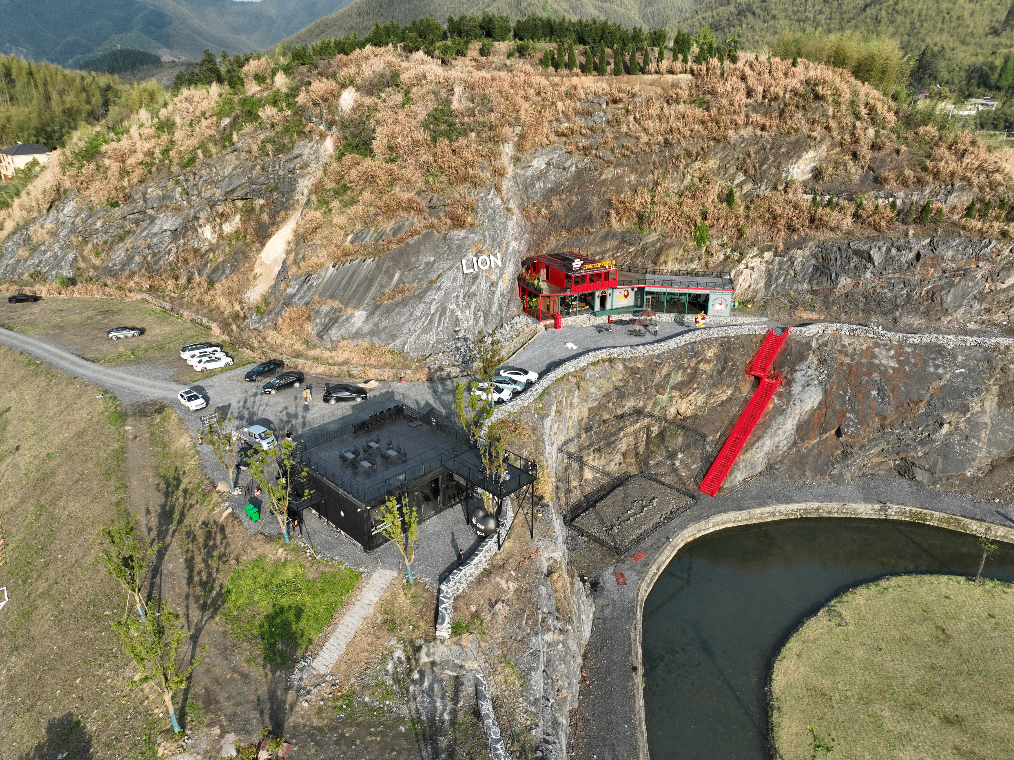 这是安吉县梅溪镇红庙村一处废弃矿坑旁的深蓝计划咖啡馆(4月7日摄,无人机照片)。新华社记者 翁忻旸 摄