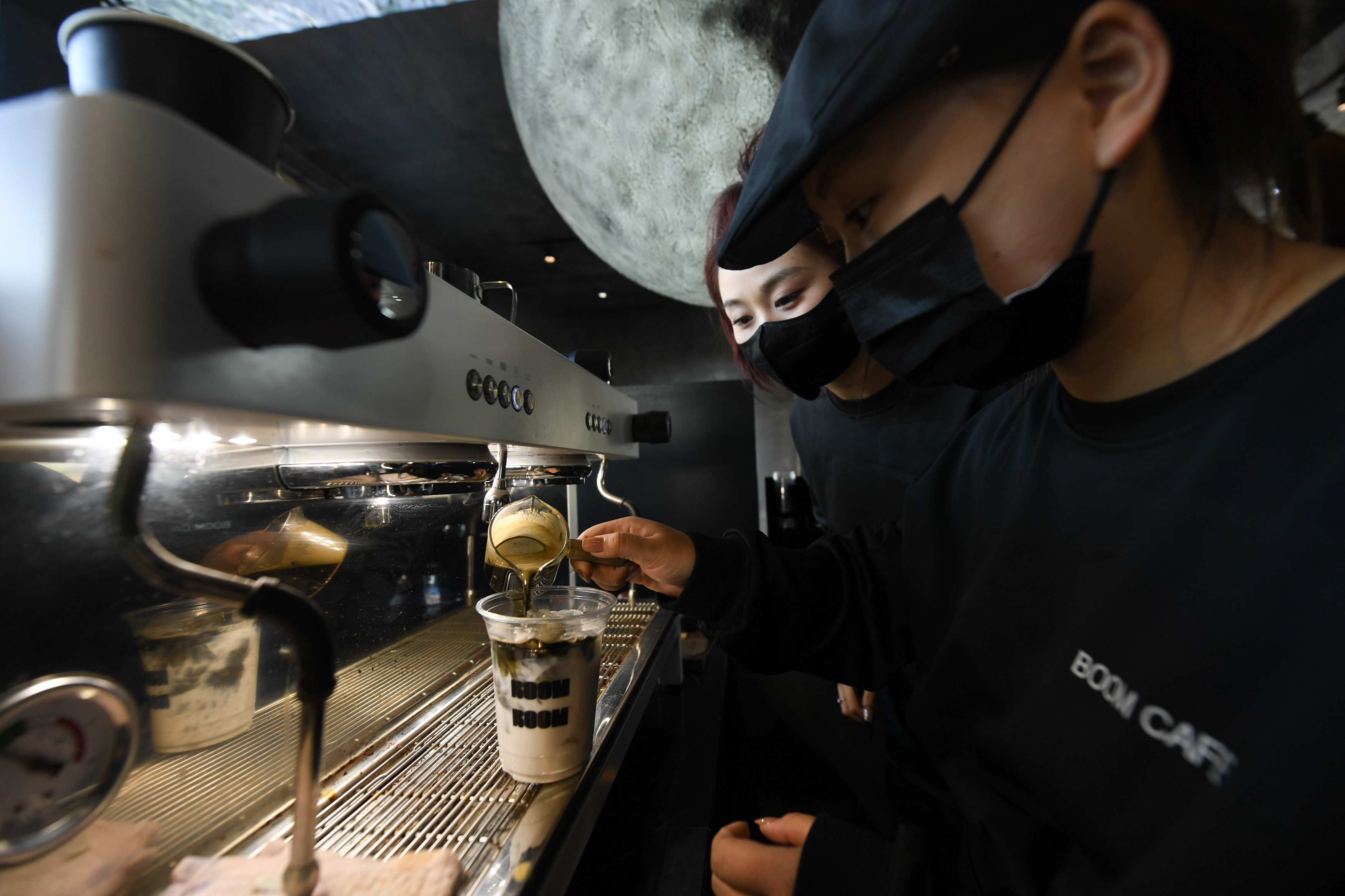 4月7日,安吉县上墅乡罗村一咖啡馆的工作人员在为顾客制作饮品。新华社记者 翁忻旸 摄