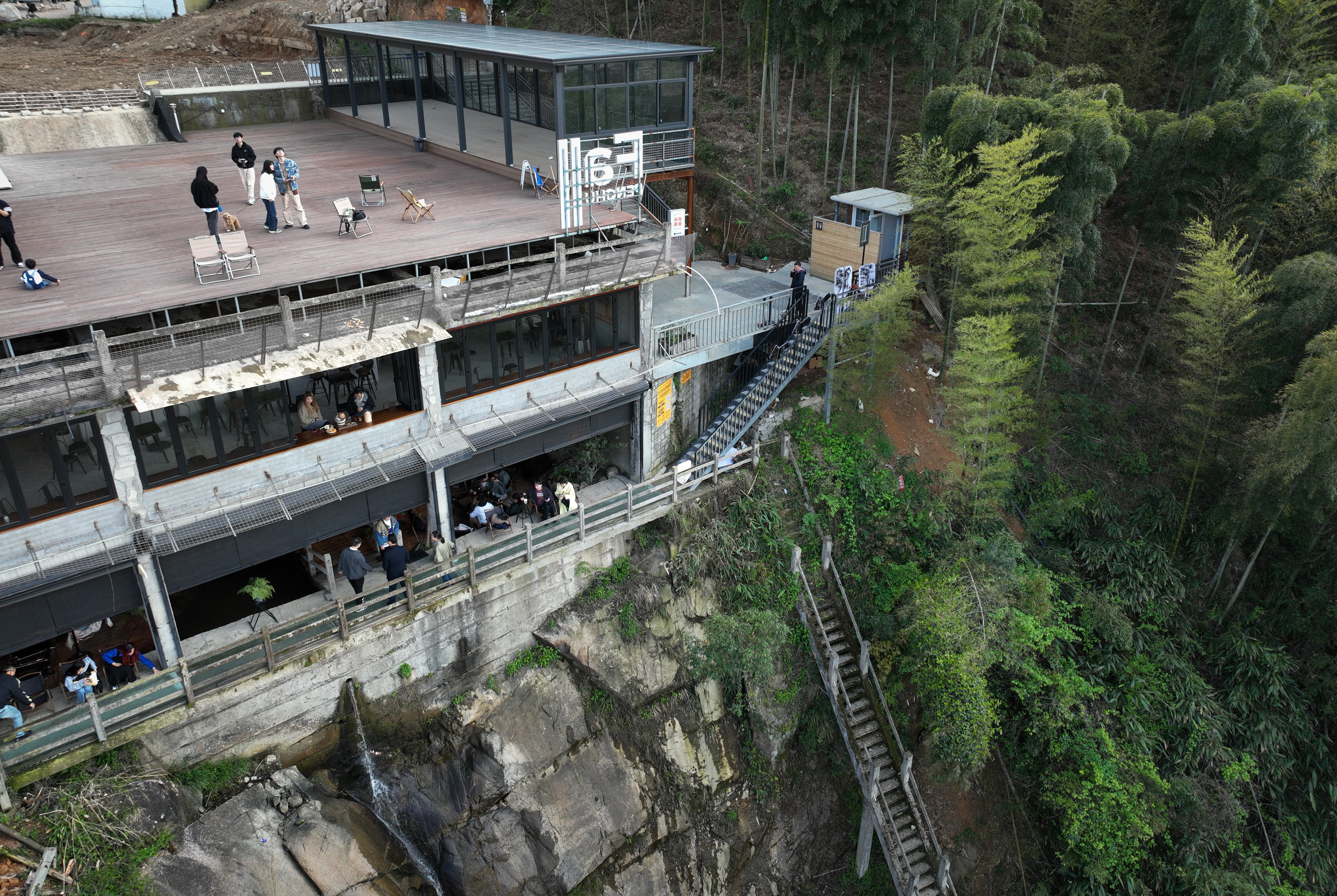 这是安吉县报福镇百丈坞村的瀑布咖啡馆(4月7日摄,无人机照片)。新华社记者 翁忻旸 摄