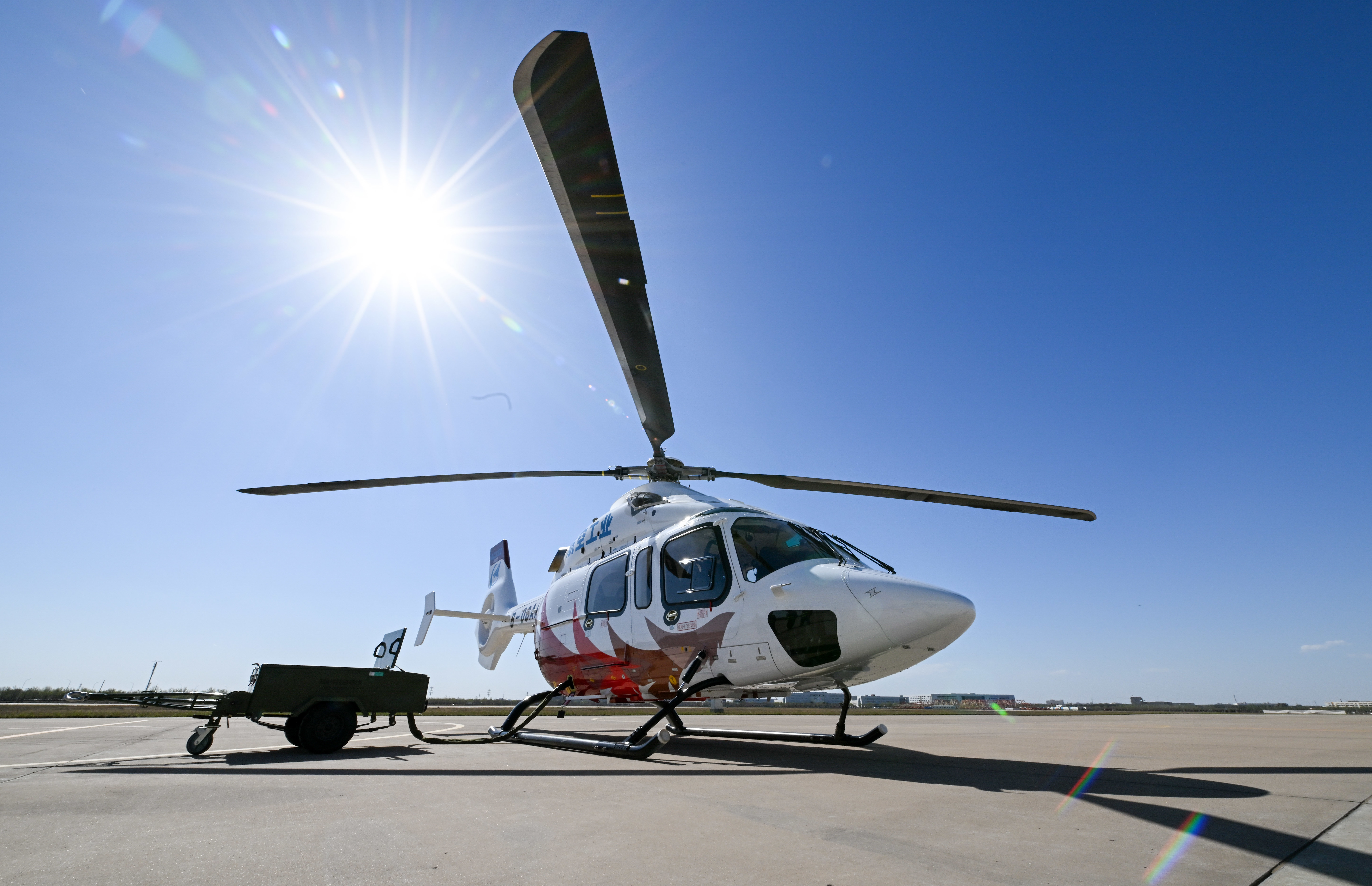 这是4月7日在航空工业天津直升机有限责任公司停机坪拍摄的“吉祥鸟”AC332直升机。新华社记者 孙凡越 摄