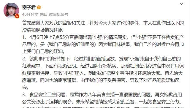 对此,密子君回应:4月6日晚上7点55分直播间出现“小强”的情况属实,但“小强”不是正在售卖的产品里的,是主播自己熬制的红油里的发现 。
