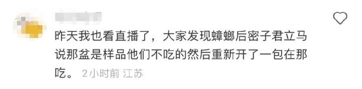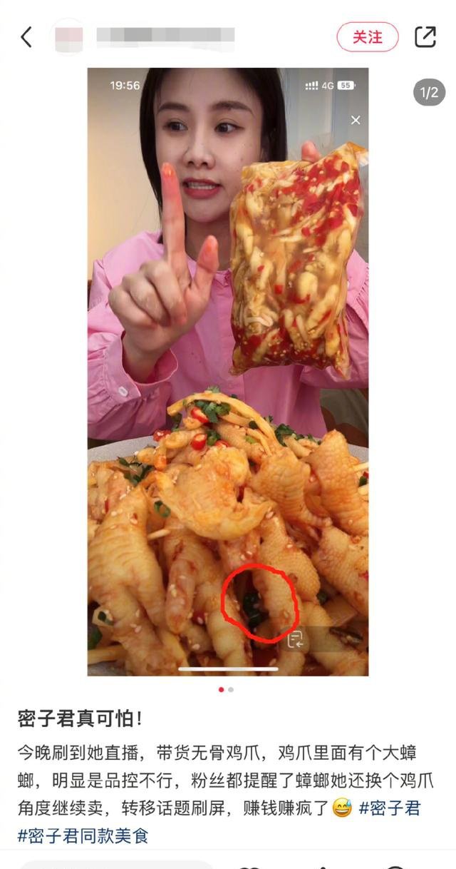 有网友爆料在观看美食博主密子君直播时,发现其售卖的无骨鸡爪中有一只蟑螂,有粉丝留言提醒,但密子君当晚并未停止售卖该产品。对此,有网友发文吐槽“赚钱赚疯了!”