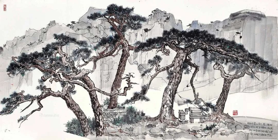 1980年作 泰山五大夫松写生 镜框