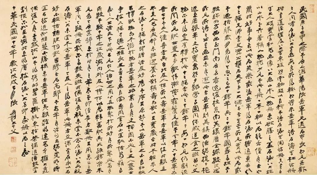 「中行庐」藏画之张大千行书《张岳军先生印治石涛通景屏风》序以1860万港元成交。全文近八百五十字,呈现于近四尺整幅之上,通篇章法平正流畅、气势如虹,尽显大千精力、体力、目力之极佳状态,为其叙事文书法之代表作!